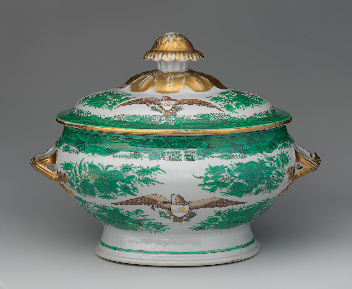 This is one of the more striking porcelains to emerge from the American trade with China. The four quadrants of the so-called Fitzhugh pattern of leaves and flowers, rendered in brilliant green enamels, serve to contrast with and accentuate the large spread eagle clutching an olive branch and a bundle of arrows in its talons. Such porcelains often feature the shield of the United States in the center of the eagle's body, yet here the shield encloses a monogram or initials—in this case an M—that would have been painted on site in Canton per instructions given by the purchaser.