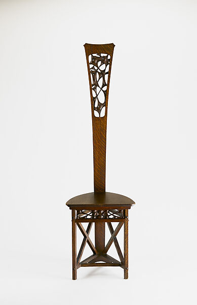 This desk chair designed by the partnership of Charles Rohlfs and Anna Katharine Green is extraordinarily modernistic and forward thinking in design. Its dramatic and graceful form is brilliantly foiled by the complex pierced and carved surfaces. Subtleties such as the parabolic-shaped seat, delicate cross bracing, and complicated trapezoidal legs further distinguish this important early work of their oeuvre. The chair, one of the artists’ personal favorites, presents something entirely different from much of their work and is quite simply, probably their most important piece. Although the form has loose prototypes in the tall Strozzi chair in the Met’s collection, with its form resting on three legs, shaped seat, and tall narrow tapered back, which also takes full advantage of the veining of the wood for its aesthetic effect, it is arguably the Rohlfs’s most inventive design. In fact it is almost modernistic in the forward-thinking of the design. The meticulous carving on the back is perhaps one of the most unusual features. Its asymmetrical organic pattern is a representation of the cellular structure of oak as seen under magnification. The couple’s interest in microscopes derives from Green’s interest in crime-scene forensic evidence, which she incorporated in her mystery novel, one of the first to do so. The couple’s admiration for the beauty of wood grain may have led to their experiments and the creation of this imaginative chair based on microscopic imagery. The chair’s structure and decorative motif brilliantly combine Rohlfs’ skills in carving and design and Green’s interest in science.