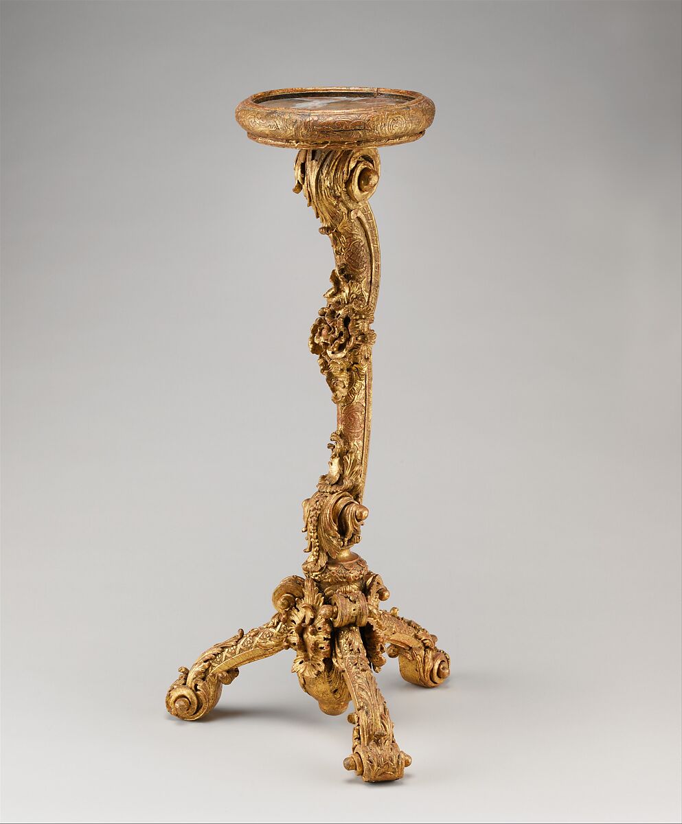 The candlestand discussed here, one of a pair in the Museum's collection,[4] was made to be moved about as needed among the smaller rooms that became fashionable as the eighteenth century advanced. Some details of the decoration, like the trelliswork on the legs, are reminiscent of silver furniture and of goldsmith's work. The form of the stands is certainly based on earlier silver designs.[5] It is evident, however, that the designer of this piece was familiar with the new style of ornamentation that was being adapted from France. The lobed and shell-encrusted, or rocaille, formations of the Rococo are present, but, as is also true of a contemporary South German commode in the Museum's collection (acc. no. 28.154), the basic form of the furniture has not been distorted or obliterated by them. The piece is a straightforward tripod structure, its bold scroll feet clearly attached to the stand. The additive rather than fully unified nature of the decoration suggests a date of 1730–35, which is consistent with the trelliswork ground of the gilding. During these years François Cuvilliés (1695–1768) designed five elaborately gilded console tables for the Green Gallery at the Munich Residenz, where they have survived, in situ, 270 years of turbulent history.[6] They mark a major step toward the fully Rococo silvered console tables by Cuvilliés in the Hall of Mirrors at the Amalienburg hunting lodge in the park of Nymphenburg Palace outside Munich.[7] The Metropolitan's candlestands cannot be associated directly with Cuvilliés; however, their controlled and bold shape, the picturesque lobed shell forms, and asymmetrical ornament indicate that the maker had firsthand knowledge of the decorative work going on at the palace in Munich at this time.