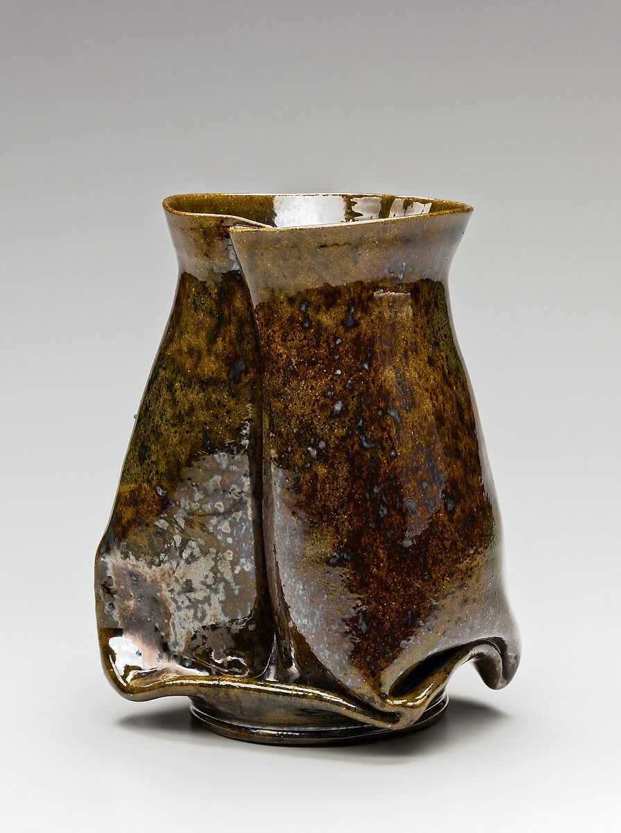 Dramatic extremes of contortion can be seen in Ohr’s vases, such as this one. With deep folds at the bottom, the vessel sags dangerously downward, giving the appearance of collapsed sheet metal.