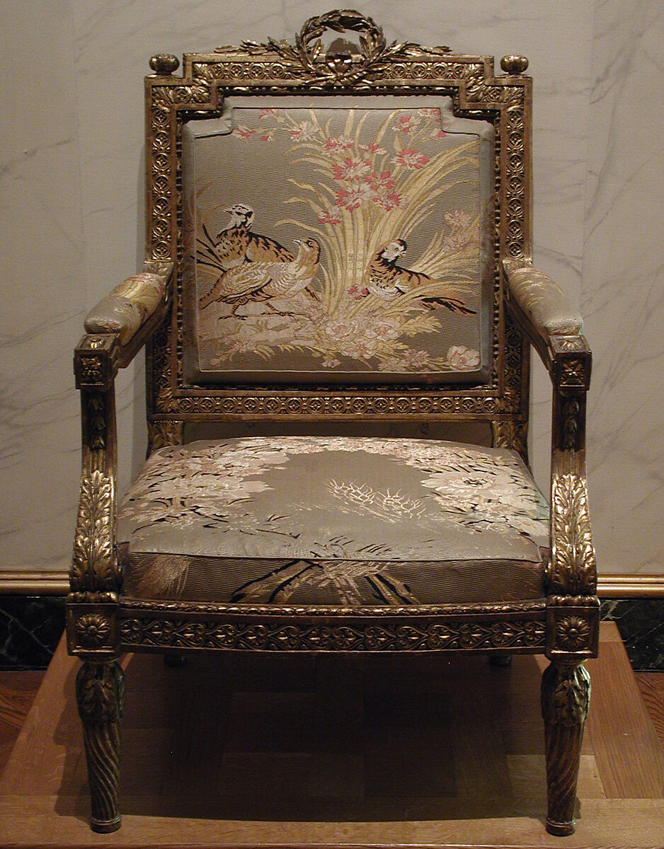 - Medium: Carved and gilded beech; modern silk brocade