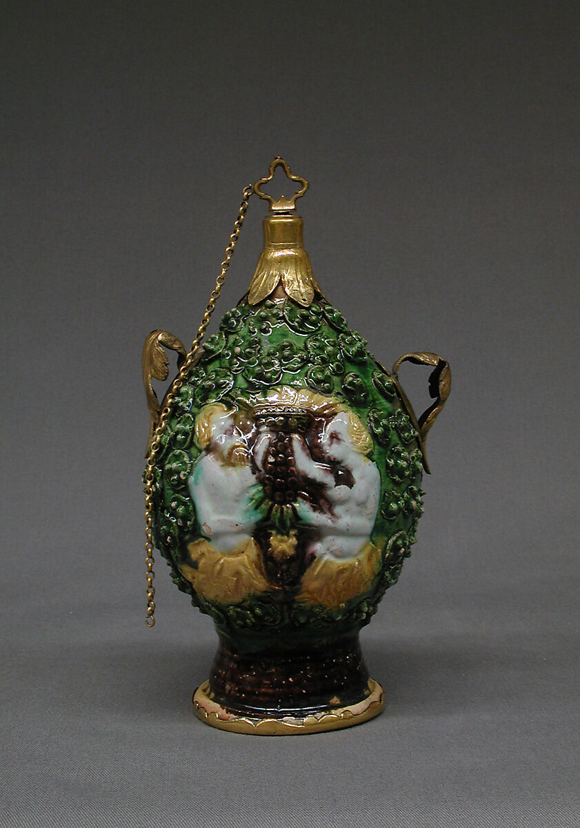 - Medium: Maiolica (tin-glazed earthenware) with yellow metal mounts