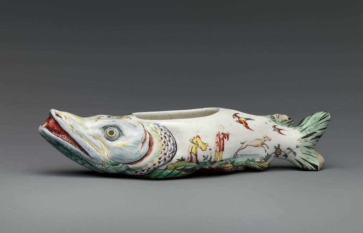 Modeled to depict a pike, or a freshwater fish, the vessel is distinguished by its razorlike teeth that are clearly delineated in the fish’s mouth. An oval opening in the upper section of the fish provides access to the hollow body, which would have probably contained a soup, broth, or some other type of liquid to be poured through the hole formed in the pike’s mouth. The tail of the fish would have allowed the vessel to be tipped in order for the liquid to be consumed. The head, gills, and tail are painted to evoke the corresponding areas of a pike’s body; at the same time, either side of the middle section of the fish is decorated with figures in an aquatic landscape. On one side, a woman is ferried in a boat by a male figure wearing a robe, presumably intended to represent a Chinese man. A large canister is located prominently in the front of the boat. On the other side, two figures wearing similar robes stand near a leaping doglike animal, the identification of which is difficult to determine.