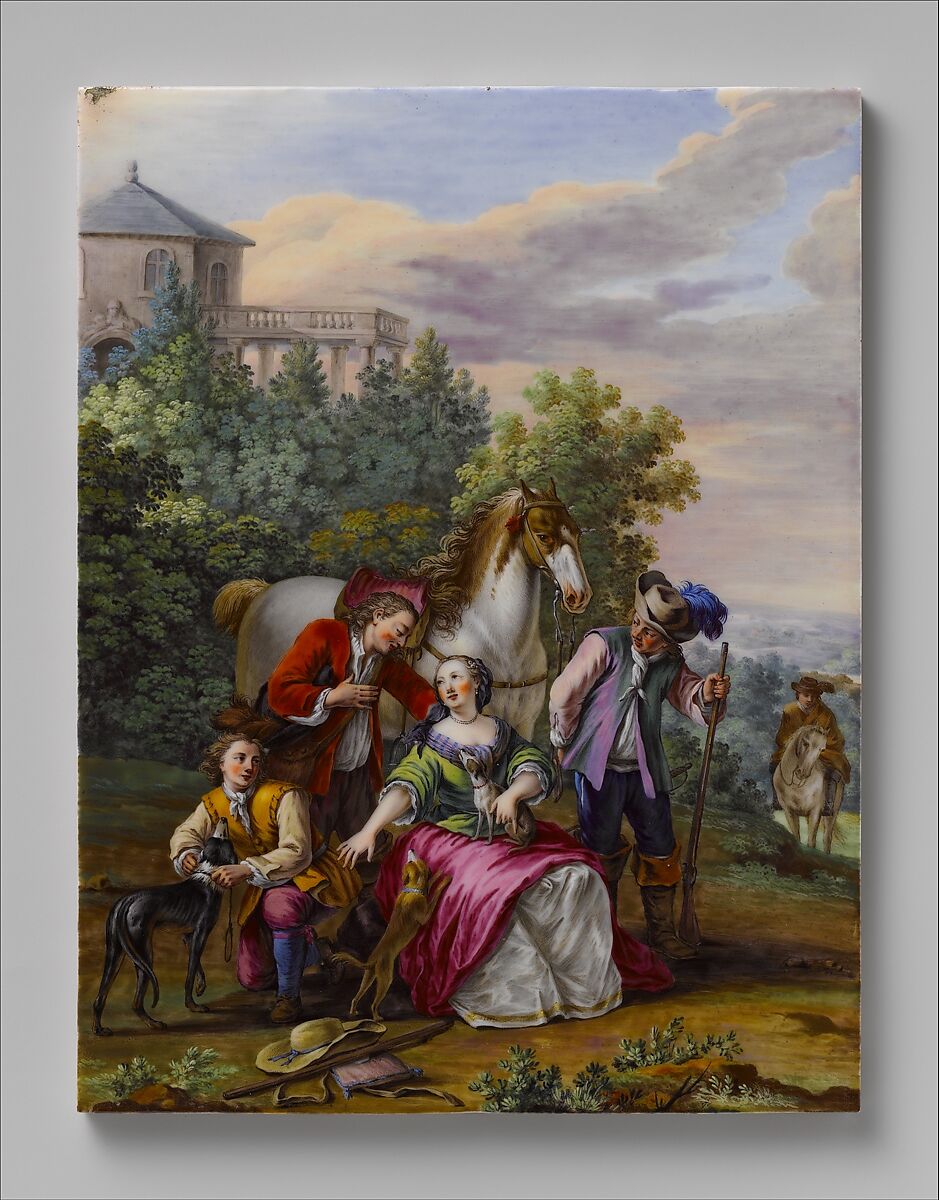 For the composition on this plaque, Dodin has selected elements from a painting entitled La Halte de chasseurs (The Hunters’ Rest), by the Flemish artist Carel (Charles-André) van Falens (1683–1733). This painting, now in the Musée du Louvre, Paris,[7] was one of two presentation pieces (morceaux de réception) submitted by Van Falens in 1726 in order to gain admission to the Académie Royale de Peinture et de Sculpture, Paris. Dodin has focused his composition on one figural grouping from the larger painting, and he has eliminated one figure and substituted another from a different section of Van Falens’s work. The reasons for Dodin’s alterations to the composition are not immediately clear, though the reduced compositional focus may be explained by the vertical format of the porcelain plaque in contrast to the horizontal format of the painting. Dodin returned to Van Falens’s composition on at least four other occasions to decorate both plaques and vases. The substitution of the figures is found only on the Museum’s plaque; Van Falens’s original grouping of the seated woman with figures in attendance is found on a Sèvres vase (pot-pourri Hébert) of 1762 at Waddesdon Manor, Buckinghamshire, England,[8] a vase (pot-pourri feuilles de mirte) from around 1762 at the Huntington Library, Art Collections, and Botanical Gardens, San Marino, California,[9] and on a plaque mounted on an early nineteenth-century fall-front secretary. [10] Another plaque with the same scene, now serving as the top of an early nineteenth- century table, is reputed to be at Syon Park, Middlesex, England.[11]