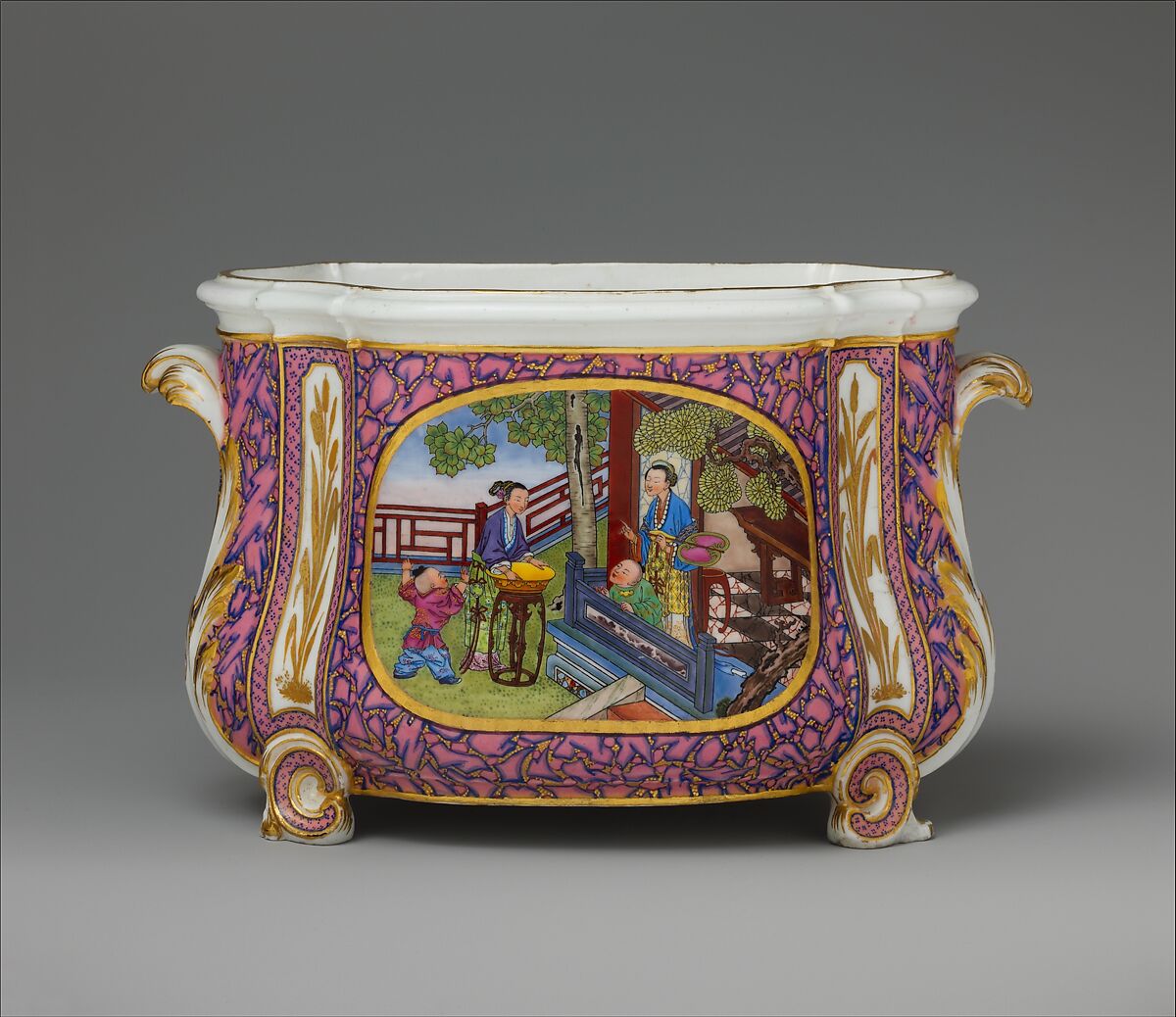 Dodin’s chinoiseries appear to have been painted during a four-year period (1760–63) only, and twenty-seven works by him in this style have been identified.[2] Factory sales records indicate that fifteen of these pieces were acquired by Madame de Pompadour (1721–1764) and five by King Louis XV (1710–1774), indicating the popularity of Dodin’s work in this vein at the French court. Many of the factory’s more exuberant and expensive models were chosen for Dodin to decorate in this style, such as the pair of potpourri vases (pot-pourri fontaine) at the J. Paul Getty Museum, Los Angeles,[3] a pair of elephant-head vases (vase à tête d’éléphant) at the Walters Art Museum, Baltimore,[4] and four vases and a clock forming a garniture now divided between the Musée du Louvre, Paris, and the Walters Art Museum.[5]