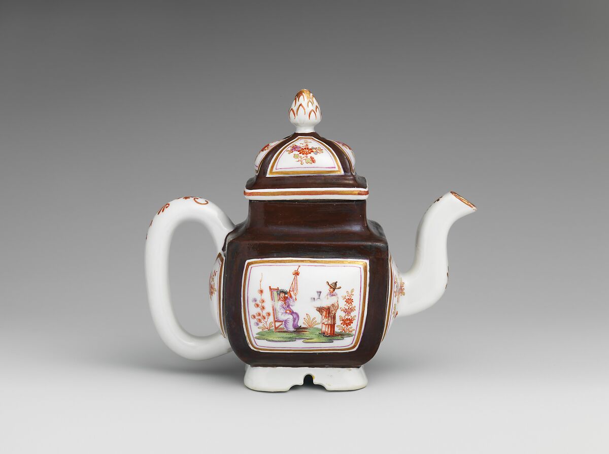 Du Paquier potters clearly were familiar with Chinese teawares, as they imitated and adapted their forms. Here, both the four-cornered shape and the arched sections of the foot were copied from Chinese models. The brown ground, also Chinese in origin, is a rare example of the use of a ground color at Du Paquier; inside the cartouches are chinoiserie scenes in the Meissen style of Johann Gregorious Höroldt (1696–1775).