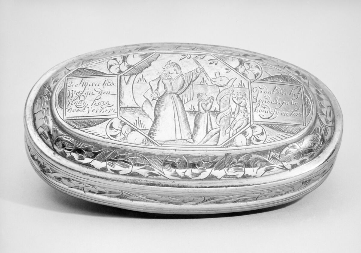 The box is oval. The octagonal panel on the lid is engraved with a scene of Moses and the brazen serpent. Three worshippers are looking at the serpent. The panel is framed by leaf scrolls and is flanked by the inscription: Siet moses in de wostijn den slang hoog doet verheve / op dat die het soude sien behoude sij en leve (See how Moses holds high the serpent in the desert/ so that they who behold this will be saved and live). The passage illustrated is found in the Bible in Numbers 21:8-9. Moses is portrayed with horns. This tradition derived from the misinterpretation of the word cornutam, which in the Vulgate describes Moses' face at the moment he descended from Mount Sinai with the tablets of the Law. The word was intended to indicate that rays of light shone out from Moses' head, but it also means "horned." See James Hall, Dictionary of Subjects and Symbols in Art (New York, 1979) p. 213. This representation expresses belief in deliverance.