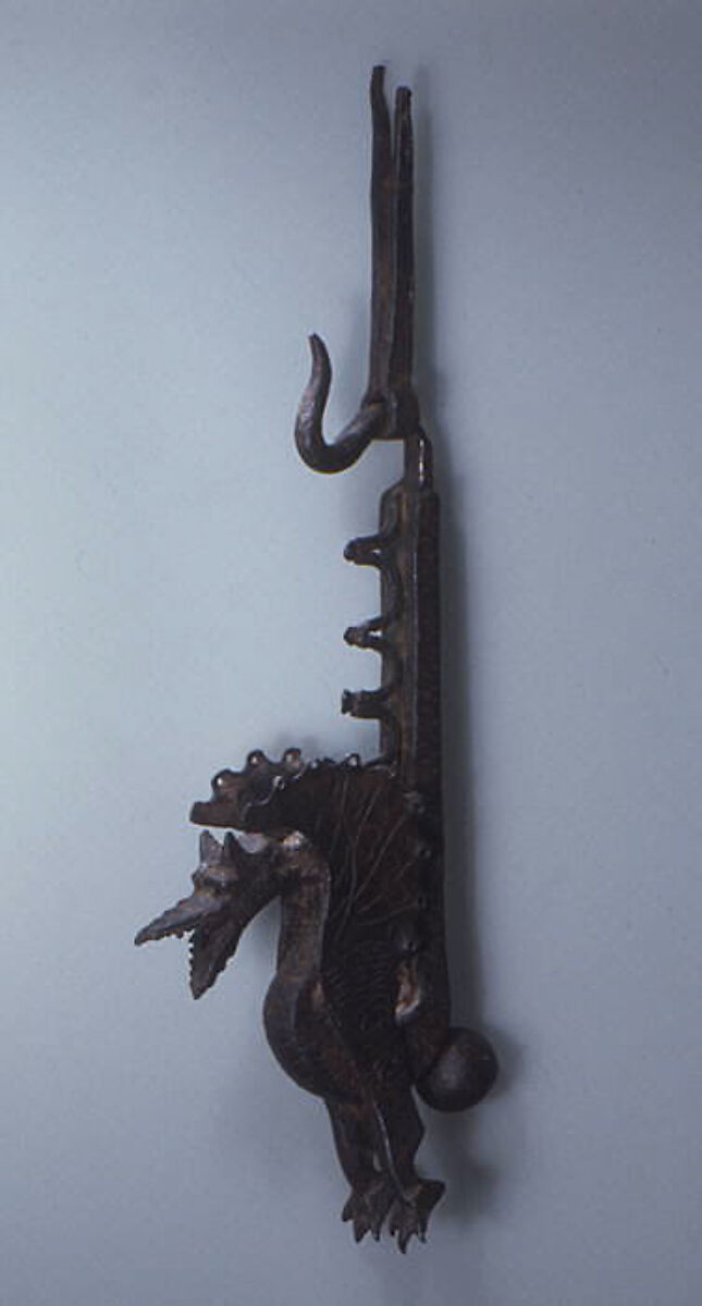This iron door knocker in the shape of a dragon was probably made in Siena, for it is most closely related to such a prized accessory of the Sienese palazzo as the griffin-shaped banner holder on the Palazzo Grisoli. The dragon is in all likelihood not much later than the first quarter of the sixteenth century, since in knockers made later in that century the spontaneity of the earlier Sienese work seems to have been lost. Both dragon and griffin were constructed from an iron bar, rapidly bent into shape while hot from the forge. Separate pieces for wings and feet were then heated, drawn out, and attached to the bar with iron rivets. Finally, hammer and punch were used to supply the identifying features of the animals and to create a satisfying surface decoration, as, for example, the pattern of hammer blows on the dragon’s body that suggests its scales. These vivacious creatures demonstrate the strength and liveliness of form of the best work of the Tuscan Renaissance blacksmiths.