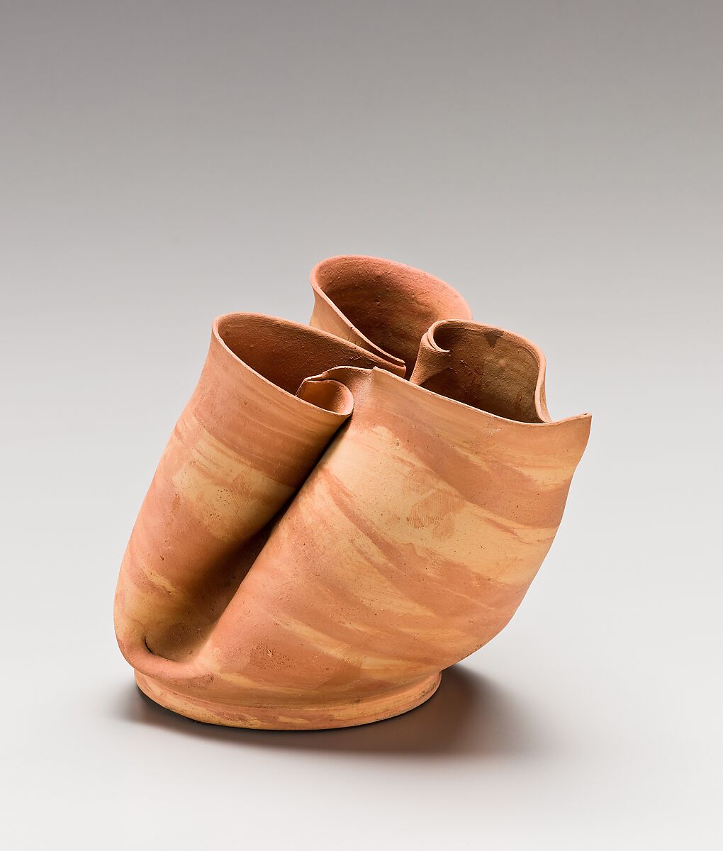 With some objects, including this bowl, Ohr folded the walls inward, obscuring the distinction between the vessel’s interior and exterior. Constantly playing with the pliant clay, he folded and squeezed the walls to such a degree that some of these open bowls were, in effect, closed, denying any remnant of functionality. This work dates to the mature phase of the artist’s career when he created a number of intentionally unglazed works. Ohr achieved this effect by brushing a slip—generally red—onto the unfired clay vessel, sometimes applying the contrasting slip with his fingers, creating an effect that resembles marbleized clay. Close visual examination reveals that the second, applied clay often did not reach the deepest recesses of the folded body. These trompe l’oeil illusions constitute another of Ohr’s tricks.