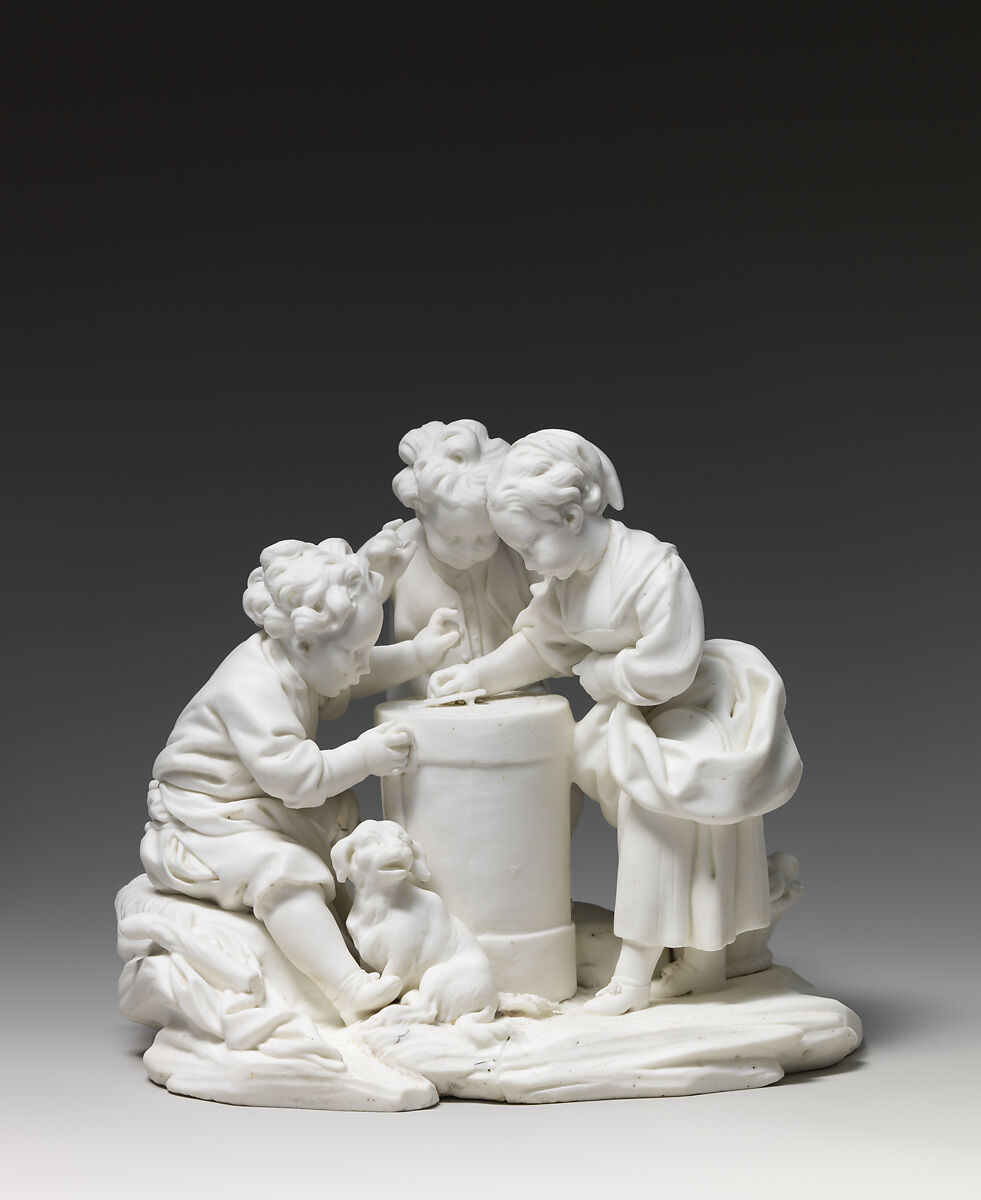 Works of art by the French artist François Boucher (1703–1770), who held the prestigious title of first painter to the king, served as a highly popular source of inspiration for artists working in a variety of media in the middle decades of the eighteenth century. Prints made after paintings by Boucher were widely circulated and provided artists with compositions that could be faithfully reproduced in smaller scale or adapted to three-dimensional porcelain sculpture. Works by Boucher served as the source not only for the painted scenes on vases and snuffboxes, but also for the porcelain figures which were listed as "Enfants Boucher" (Boucher Children) in the factory’s sales ledgers.