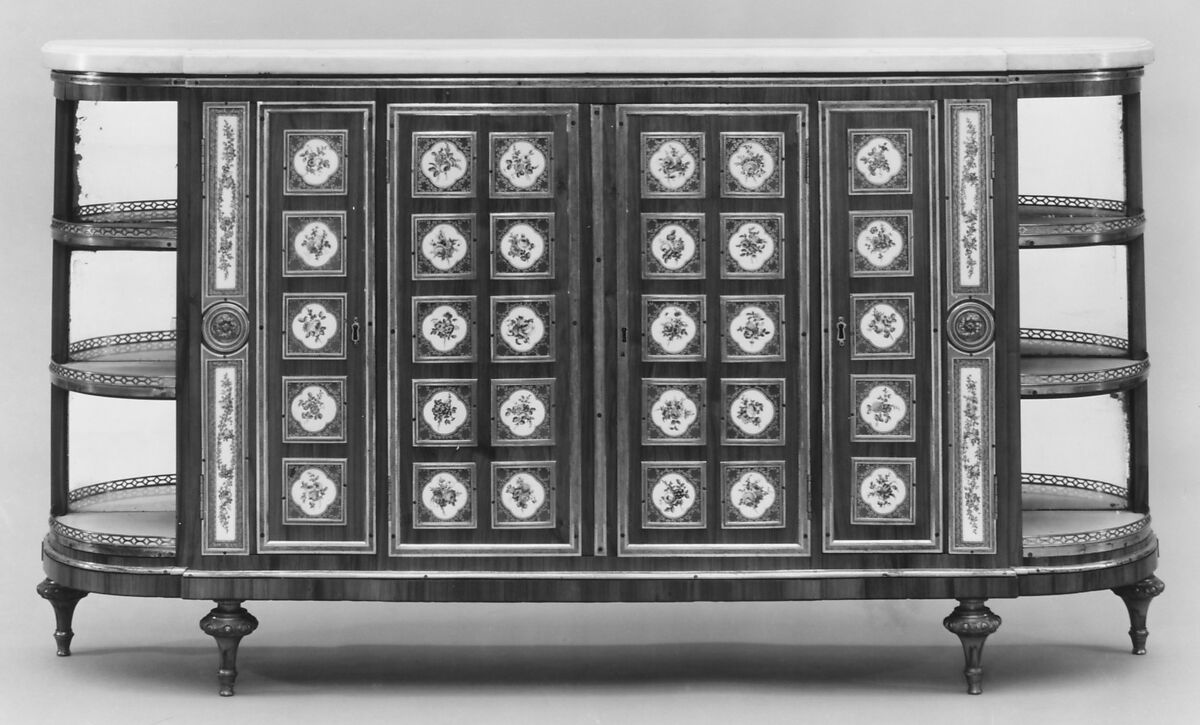 This cabinet mounted with 34 Sèvres porcelain plaques comes from the Hillingdon Collection, which was founded by Sir Charles Mills (1792–1880), a partner in the great firm of Glyn, Mills, Currie and Company, bankers to the British royal family. Tradition says that Sir Charles acquired the collection during a series of visits to France in the first half of the nineteenth century. Sir Charles’ son was created first Baron Hillingdon in 1886. In 1937, his descendants sold the collection to the well-known art dealers Duveen Brothers. Although various collectors, such as Calouste Gulbenkian and J. Paul Getty, were interested in buying the Hillingdon Collection, ultimately the majority of the artworks, including seventeen pieces of porcelain-mounted furniture, were acquired in 1947 by the cultural foundation that had been established by the American businessman and philanthropist Samuel H. Kress (1863–1955). Under the leadership of Samuel’s brother Rush H. Kress (1877–1963), the Samuel H. Kress Foundation gave these extraordinary objects to the Museum in 1958, making it the foremost repository in the world of Sèvres-mounted furniture.
