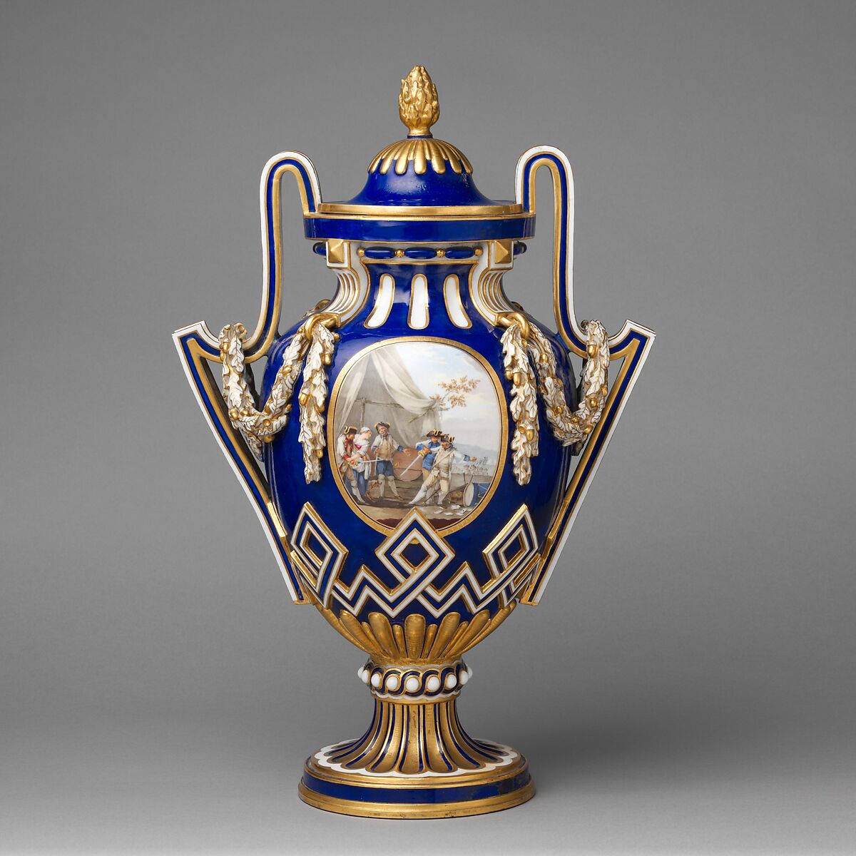 This vase is notable for the bold zigzag-and-diamond ornament above the foot, the highly architectural handles, and the draped oak garlands linking the handles to the vase. These elements reflect a growing awareness at Sèvres of the Neoclassical style, which was gaining popularity in France in the 1760s. Curiously, the painted decoration showing soldiers in an encampment, like that found on other early Neoclassical vases from Sèvres, ignores the new stylistic influence.