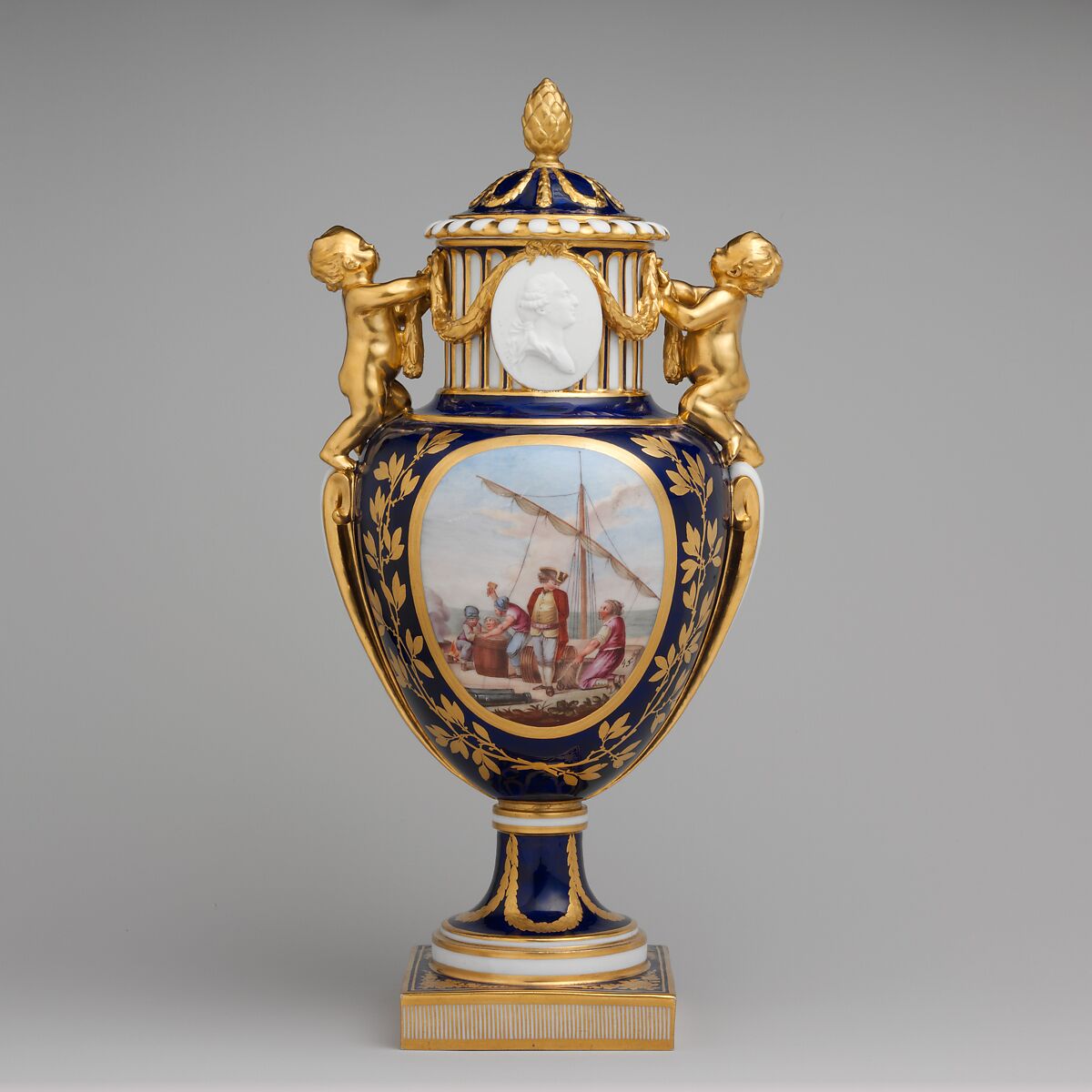 While the Sèvres factory produced a variety of vases for the display and growing of flowers, a large percentage of its vases were intended for ornamental purposes only. This model, with its cover and decorative handles in the form of cherubs clearly belongs to this latter category. The Museum's vase is decorated with biscuit (unglazed) porcelain medallions depicting Louis XVI and Marie-Antoinette.