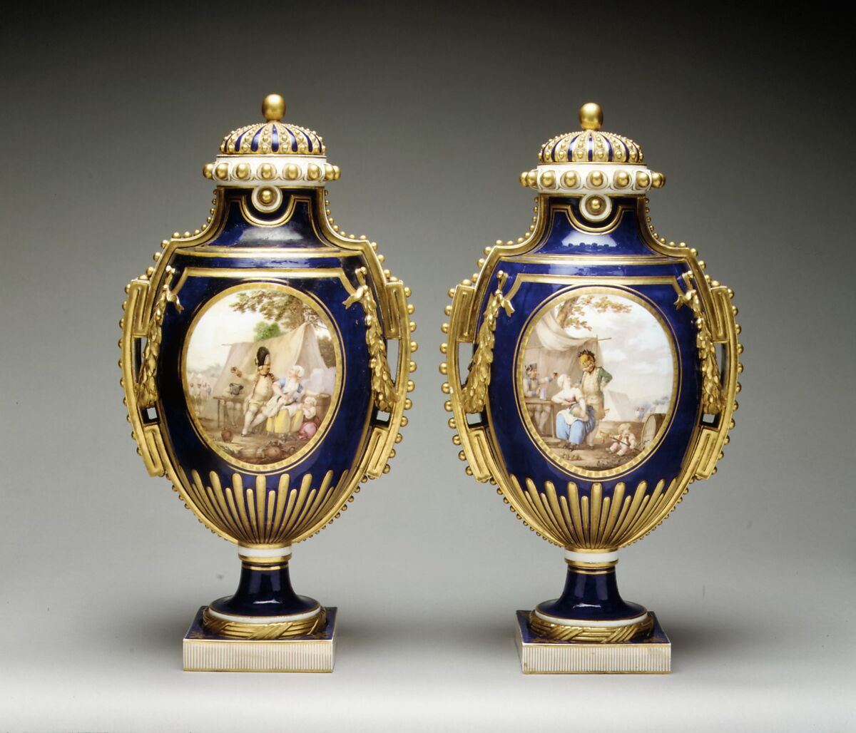 This model of vase, introduced at the Sèvres factory in 1766, represents one of the earliest neoclassical forms produced there. In contrast to the relative severity of the vase's form, the military scenes of the oval reserves do not reflect the prevailing neoclassical taste of the 1760s and 1770s. This lack of correspondence between the painted decoration and the neoclassical form was typical of the factory's production during this period.