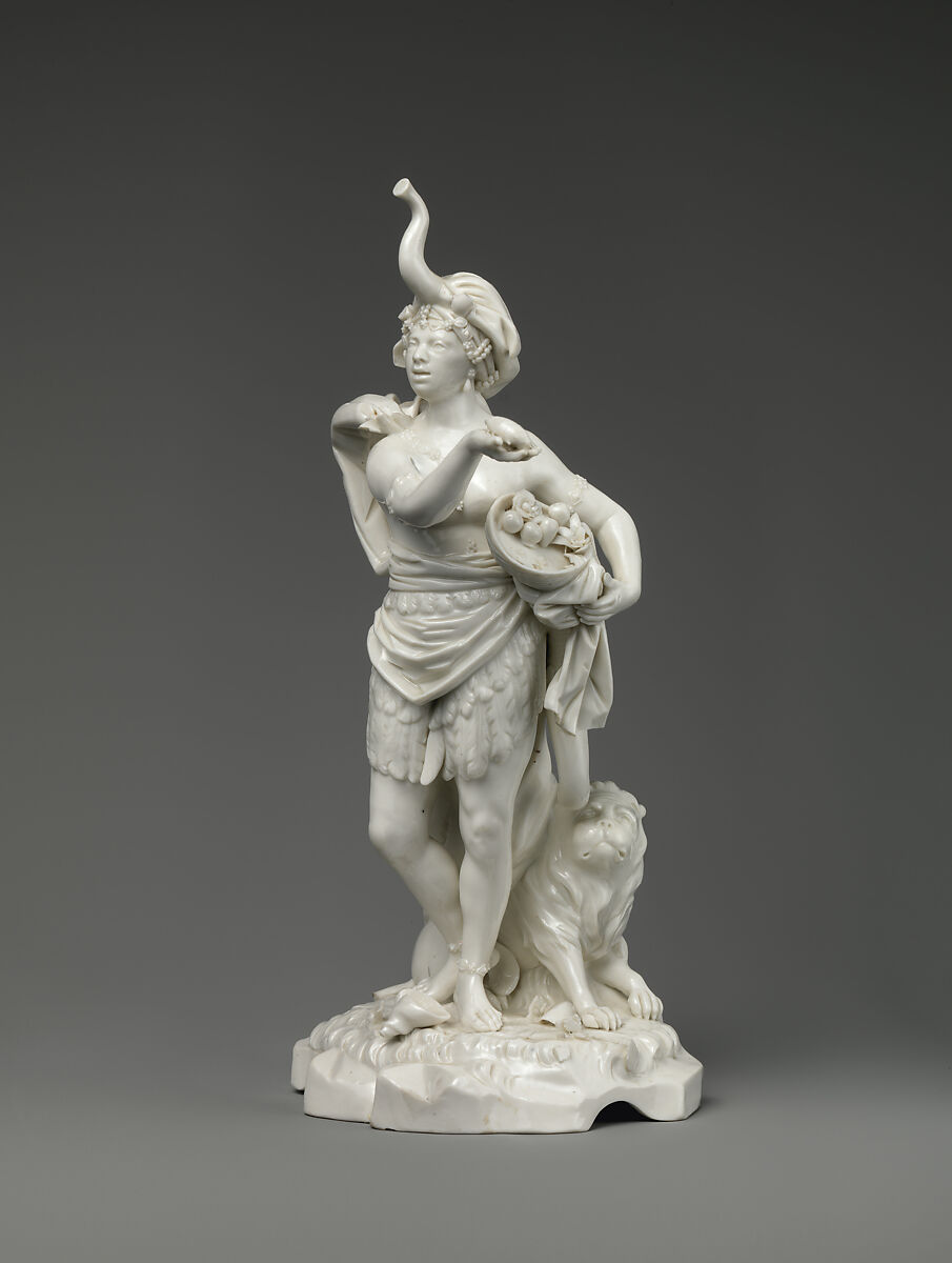 In the eighteenth century, small-scale figurines representing the allegories of the four continents were a popular fixture in genteel spaces. While the dissemination of such iconography in print form encouraged scholarly reflection, its migration into the realm of the decorative arts prompted whimsy and pleasure. The polished surfaces and exquisite detail of this ambitious group by the Fulda Manufactory afforded European viewers the intimate, tactile experience of beholding representations of other continents, whose precious goods and natural resources they coveted. Africa’s lavish attributes, including jewelry, shells, and a cornucopia brimming with fruits, suggest Europe’s growing economic interest in the continent.