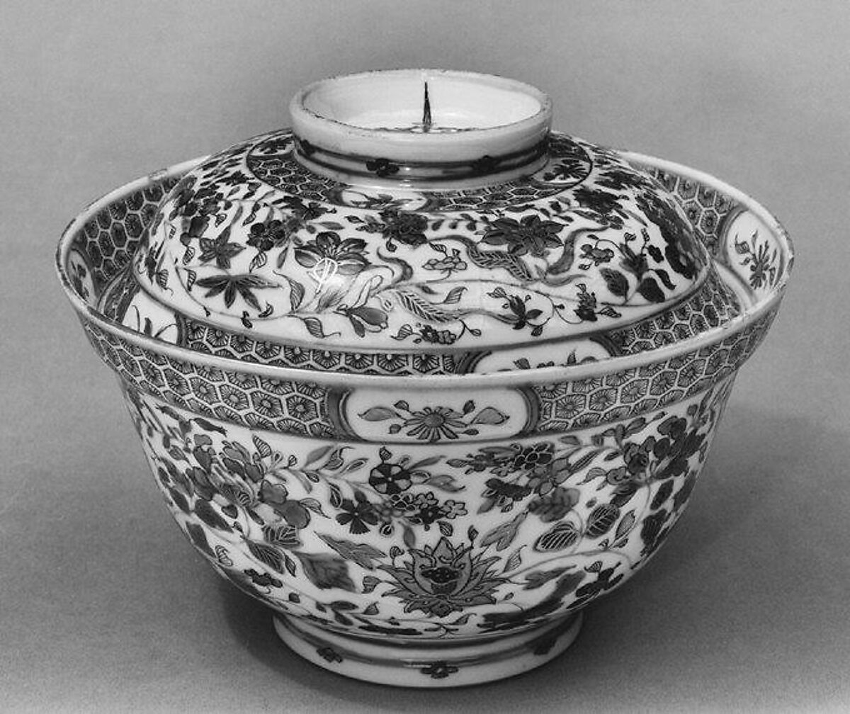 The coat of arms that appears both inside the bowl and inside the finial of the cover has been identified as that of the Craggs family. This bowl might have belonged either to James Craggs the Elder (1657–1721) or to his son, James Craggs the Younger (1686–1721) who was principal Secretary of State to George I.