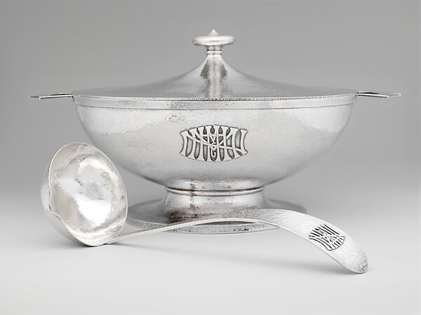 Around 1904, Chicago’s Marshall Field and Company established a department for silver and jewelry on the tenth floor of its State Street department store. In a fully equipped workshop, metalsmiths combined traditional craft techniques with modern machine processes to meet growing public demand. This bold tureen and the accompanying ladle, each adorned with an elaborate interlaced monogram, reflect the firm’s penchant for heavily hammered surfaces.