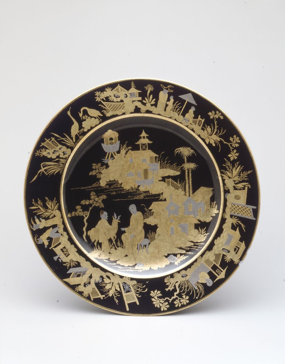 Porcelain decorated with a black ground in imitation of Asian lacquer was produced at Sèvres for about a fifteen-year period beginning in 1790. Furniture decorated with imported black lacquer panels saw a resurgence of popularity in the last two decades of the eighteenth century, and the Sèvres factory's efforts to simulate black lacquer on porcelain were probably stimulated by this renewed general interest in lacquer decoration. Black-ground Sèvres porcelain was decorated with chinoiserie scenes executed in gold, which was often applied in subtle tones of yellow, green, and red. Small decorative highlights were often executed in platinum, and the ability to apply platinum—first mastered by the factory in 1790—may have been an impetus to produce these lacquer-inspired pieces.