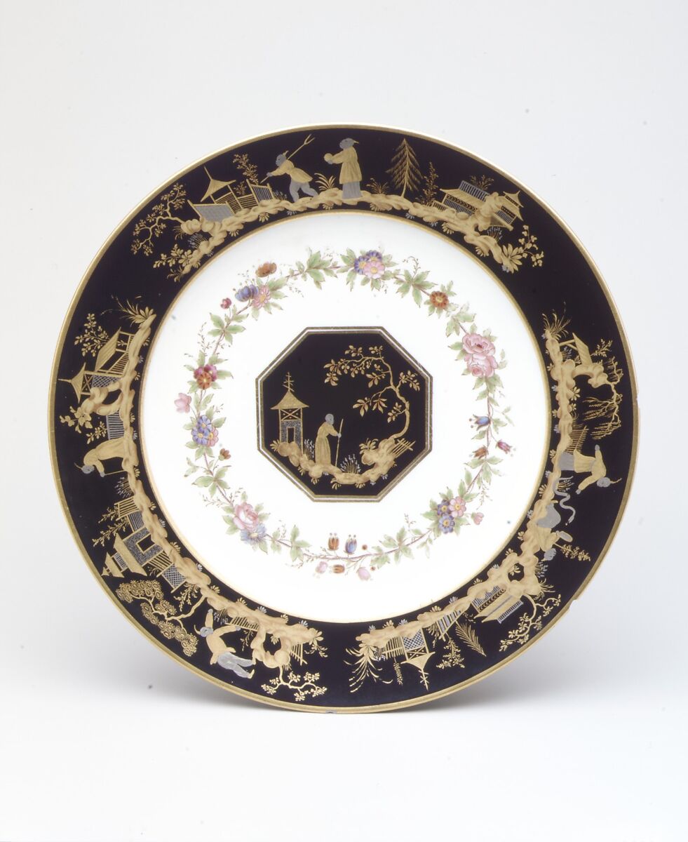 Porcelain decorated with a black ground in imitation of Asian lacquer was produced at Sèvres for about a fifteen-year period beginning in 1790. Furniture decorated with imported black lacquer panels saw a resurgence of popularity in the last two decades of the eighteenth century, and the Sèvres factory's efforts to simulate black lacquer on porcelain were probably stimulated by this renewed general interest in lacquer decoration. Black-ground Sèvres porcelain was decorated with chinoiserie scenes executed in gold, which was often applied in subtle tones of yellow, green, and red. Small decorative highlights were often executed in platinum, and the ability to apply platinum—first mastered by the factory in 1790—may have been an impetus to produce these lacquer-inspired pieces.