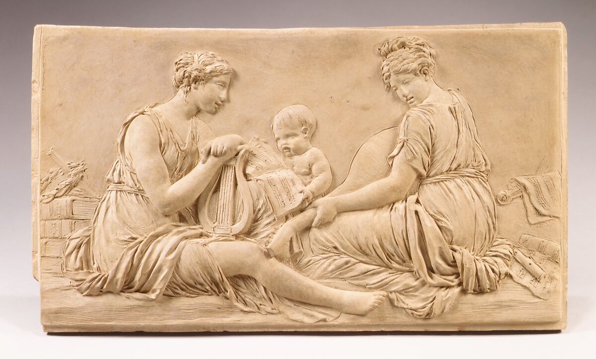 This relief and its companion (62.213.2) are pared-down versions of two of the terracotta reliefs Clodion exhibited at the Salon of 1779 representing Music, Architecture, Astronomy, and Painting (believed to be the set of four in the Musée Henry, Cherbourg). These reliefs appear to have served as the models for architectural reliefs for the Hôtel d'Osmond, Paris.