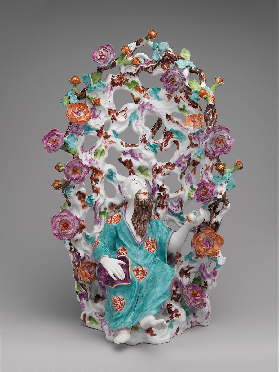 The bald, bearded Chinese man sitting in an arbor may be a depiction of Shou Lao, the Chinese god of longevity.