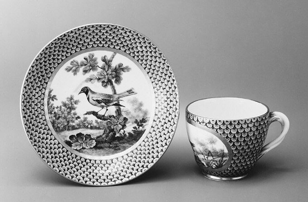 Birds were depicted on Vincennes and then Sèvres porcelain from the earliest years of production at Vincennes, but they were painted as fanciful creations and employed as decorative elements with no concern for fidelity to actual birds. Most of these early painted creatures had little delineation and their coloring was entirely arbitrary. It was not until the late 1760s that the painters at Sèvres began depicting birds that were accurate representations of those found in nature, rendered with specificity and accurate coloration. The impetus for this change was the availability of hand-colored etchings of birds published in George Edwards’s (British, 1694–1773) A Natural History of Birds (1743–51) and his Gleanings of Natural History, issued in a series of volumes between 1747 and 1764.[1] The first pieces of Sèvres porcelain decorated with birds copied from Edwards’s prints were produced for Charles Lennox (1735–1806), 3rd Duke of Richmond, who had lent his own copies of Edwards’s volumes to the factory to serve as models.[2] A dessert and tea service with ornithological decoration derived from Edwards’s works was completed in 1766 for Richmond initiating a fashion for this new type of bird painting that was to last only a relatively short time.