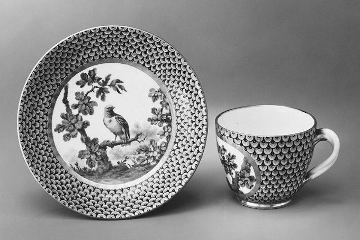 The substantial effort required to inscribe the names of the birds and their origin on the undersides of objects with bird paintings must have proved too time- consuming and thus too costly for the factory, and not all of the Sèvres porcelain decorated with birds after Edwards have this identification. Most of the works made at the factory with this type of ornithological decoration are wares for dinner services, but at least three tea services painted in this manner are known. The earliest of these tea services was produced for Richmond, cited above, and two were produced in 1767, including the Museum’s tea service.[5]