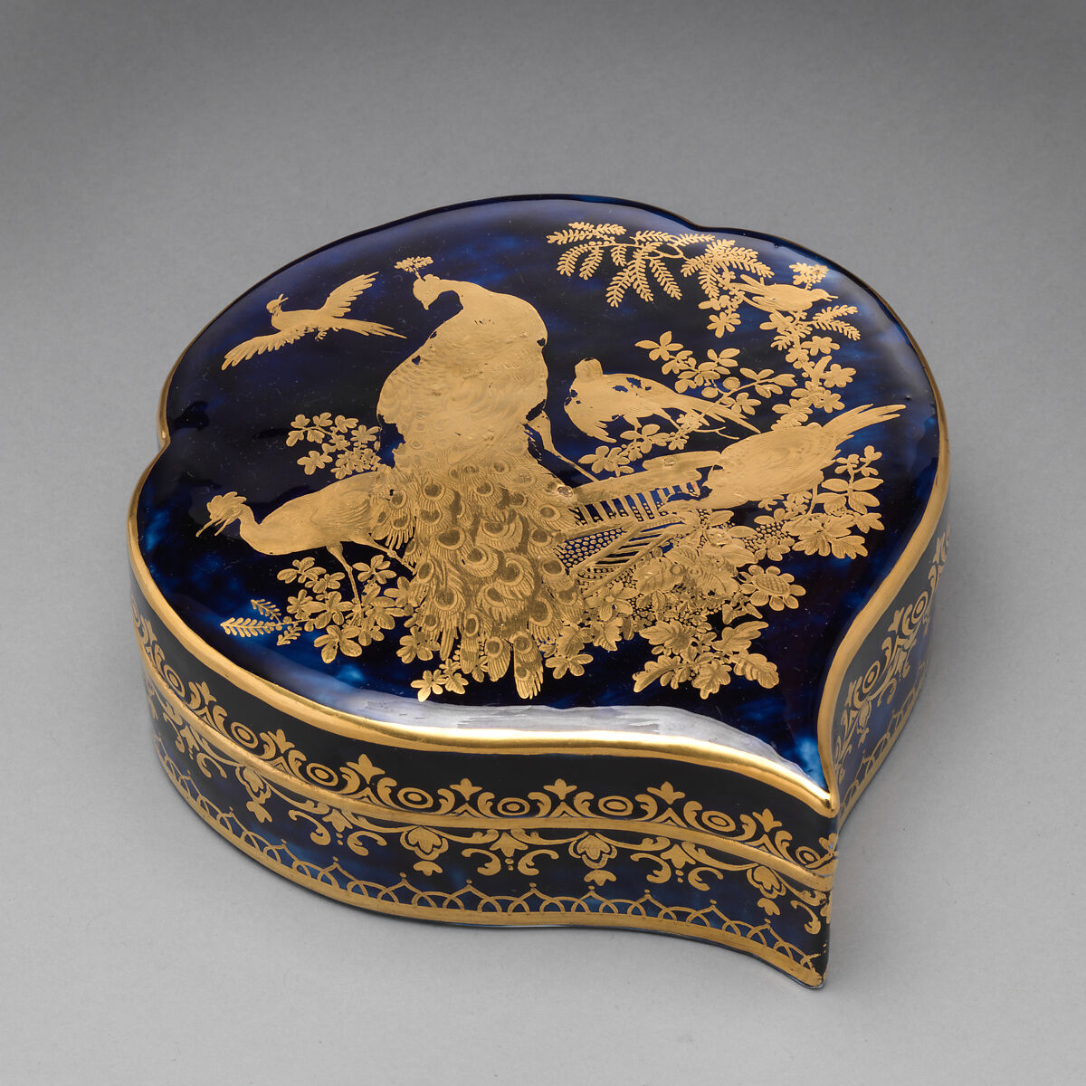 Containing a nest of smaller boxes, these pieces may have belonged to a luxurious dressing-table set similar to one advertised by the dealer Burnsall on July 21, 1764: "A most grand and capital Lot of . . . Chelsea Porcelain, containing a dressing Glass and three Drawers . . . with different Gold Instruments and Twelve Toilet Boxes to ditto, all of the rich Mazarine Blue and Gold." The deep blue ground color, known as Mazarine blue, combined with the lavish gold decoration, used at Chelsea as early as 1756, clearly was influenced by Vincennes and Sèvres porcelain.