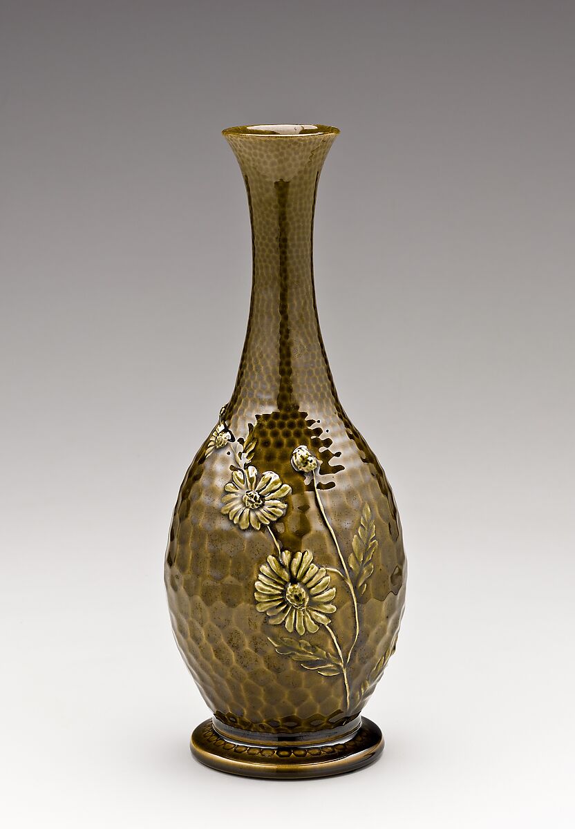 The Chelsea Keramic Art Works was the first American ceramics firm to designate itself an "art pottery." It was founded in Chelsea, Massachusetts, by members of the Robertson family, all of whom had honed their skills in the ceramics industry in Britain before coming to this country. This vase features a fully modeled wildflower spray displayed over the body of the piece. Such naturalistically rendered and asymmetrically arranged plant sprays in relief conformed to the decorative taste of the Aesthetic Movement in the late 1870s and 1880s (see also 2018.294.21; 2018.294.29). The hand-hammered surface effect is Japanese in inspiration.