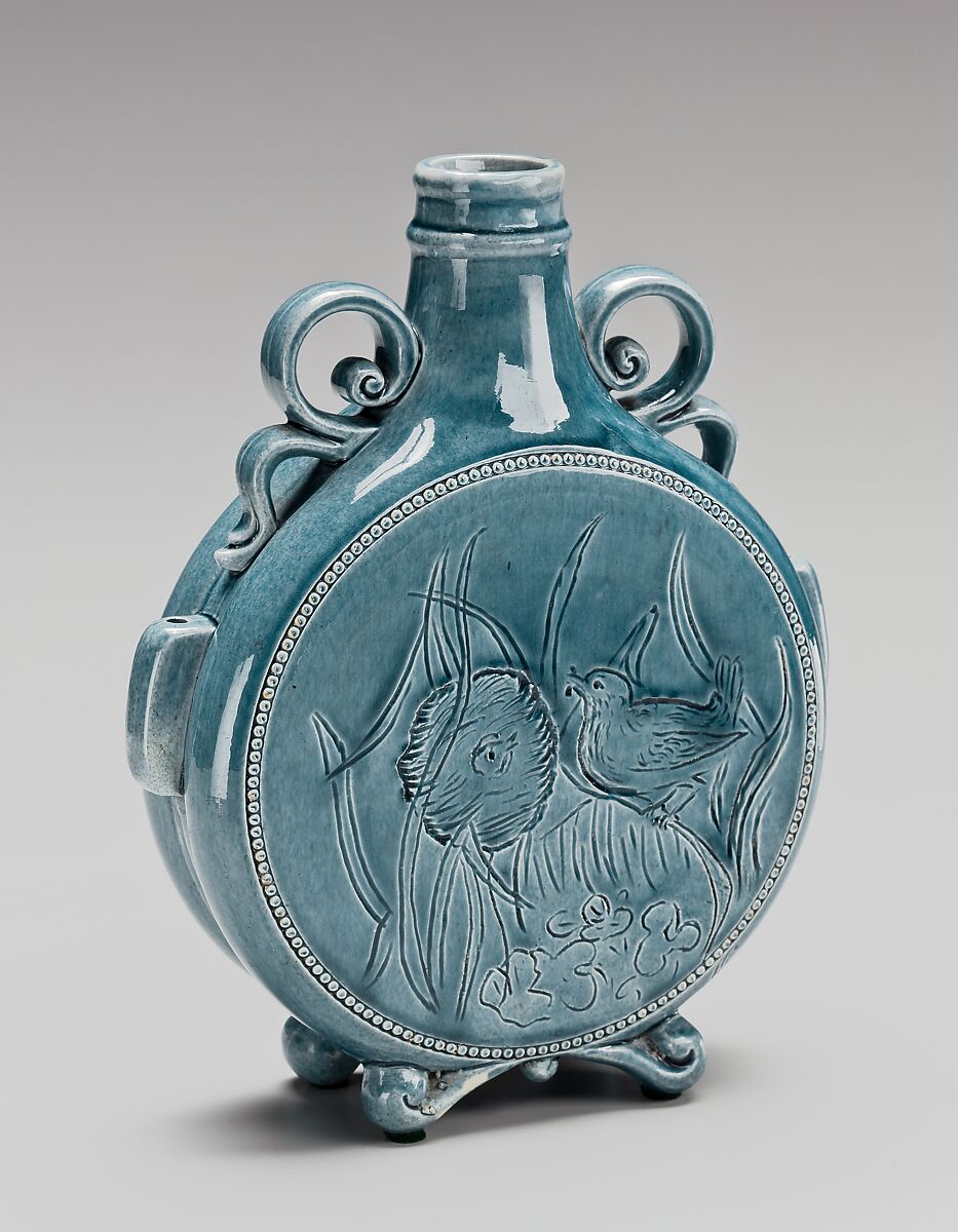 The Chelsea Keramic Art Works was the first American ceramics firm to designate itself an "art pottery." It was founded in Chelsea, Massachusetts, by members of the Robertson family, all of whom had honed their skills in the ceramics industry in Britain before coming to this country. This pilgrim vase is typical of Hugh Robertson’s work in the late 1870s and early 1880s. Although its form relates to medieval canteens, this vessel is more directly aligned with contemporary English art wares, notably vases executed at the Mintons and Doulton potteries. Here, a carved design of two nesting marsh wrens on the front and flowering plants on the back are hand-incised in a fluent styles. The plants on the back side are arranged asymmetrically, a gentle reminder of the influence of Japanese aesthetics in this country.