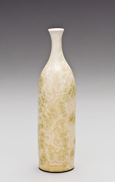 The pottery established at University City, outside of Saint Louis, Missouri, was the brainchild of visionary Edward Gardner Lewis. He sought to experiment with a new approach to women’s education, which included publishing a journal and offering mail-order classes. To launch his pottery enterprise, Lewis lured Taxile Doat, the eminent French ceramist from Sevres; Adelaide Alsop Robineau, master porcelain artist from Syracuse, New York, and her husband, Samuel; and English –born potter Frederick Hurten Rhead to University City. Having discovered a vein of kaolin clay (the key ingredient for porcelain) during the excavation for Lewis’s publishing headquarters, he decided that the pottery would exclusively focus on porcelain. The intimate environment of these superbly talented potters fostered close collaboration among the artists there. Unfortunately, University City’s Utopian ideals proved impossible to sustain, and the principle ceramists disbanded in the Spring of 1911. Later that year, however, the pottery reorganized and Doat returned to University. Although he continued to create some elaborately decorated showpieces, most of the production concentrated on cast forms, many recalling shapes Doat had produced at Sèvres. They generally featured seductive, often shimmering crystalline glazes. This double-gourd shaped vase, with its subtle crystalline glazes, exemplifies the sophisticated glazes that characterize the work of University City. In a promotional pamphlet of about 1914 the pottery claimed: "No two pieces are alike in Crystallization nor can any of the high fire Crystalline pieces to be sold be duplicated, each piece offered being an exclusive gem of the high temperature at which it is produced."