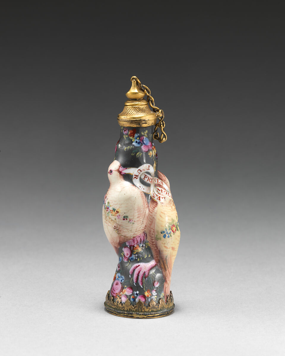 Decorated with two doves, a symbol long associated with love, this bottle would likely have been given as a romantic gift. The two birds hold a ribbon in their beaks that is inscribed with the grammatically incorrect French phrase "prenes les pour modele" intended to mean "take them [the doves] as a model." The Met has another bottle in its collection with the same design (2023.441.15).