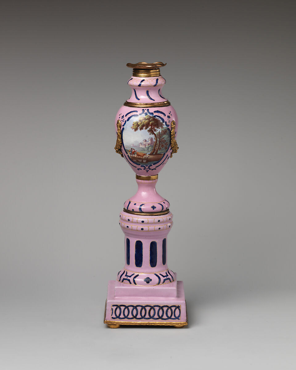 Cassolettes, also known as perfume burners or essence pots, were initially designed as functional vessels for burning or vaporizing scents to perfume a room. Soon enough, their form was adapted for purely decorative objects. These cassolettes, decorated with pastoral imagery, are a happy medium between function and ornament; though they were almost certainly not used to disperse scent, they become candlesticks when their finials are turned upside down.