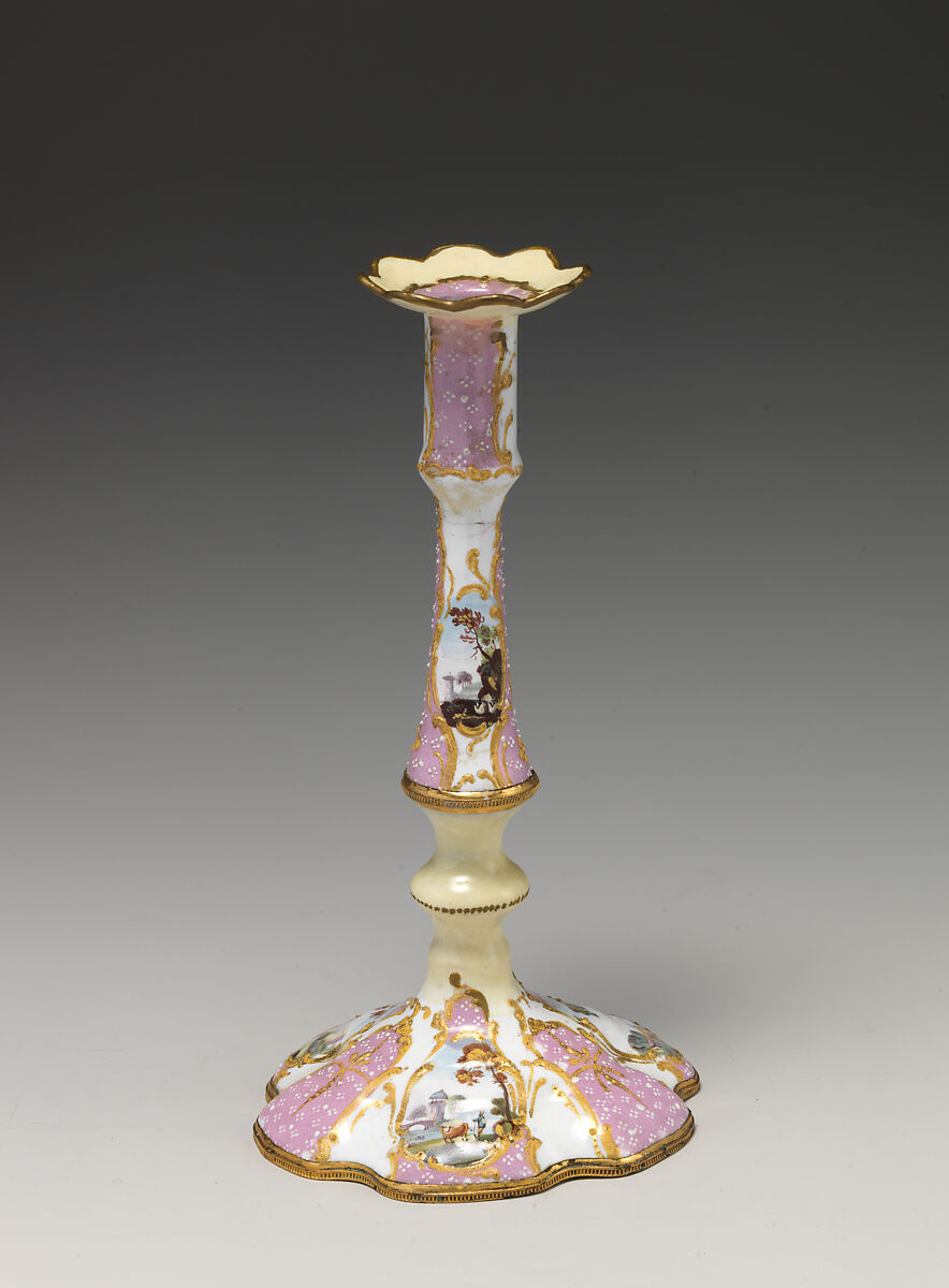 Enameled objects like this one, intended to imitate the lustrous quality of porcelain, were among the more affordable goods sold at toyshops across London and in fashionable English resort towns. Though often called "Battersea enamels" in common parlance (referring to the manufactory at York House, Battersea, operating only between 1753 and 1756), we rarely know exactly where individual pieces were made. The main centers of enamel production were in London, South Staffordshire (particularly in Bilston and Wednesbury), and Birmingham.