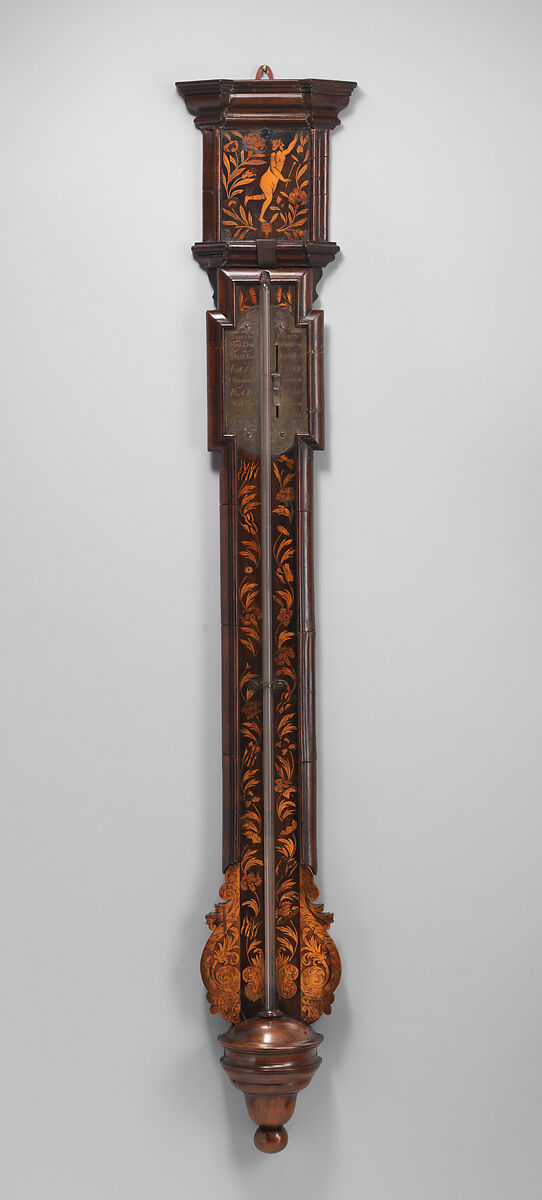- Medium: Walnut, with floral marquetry, veneered on oak; brass; glass; mercury