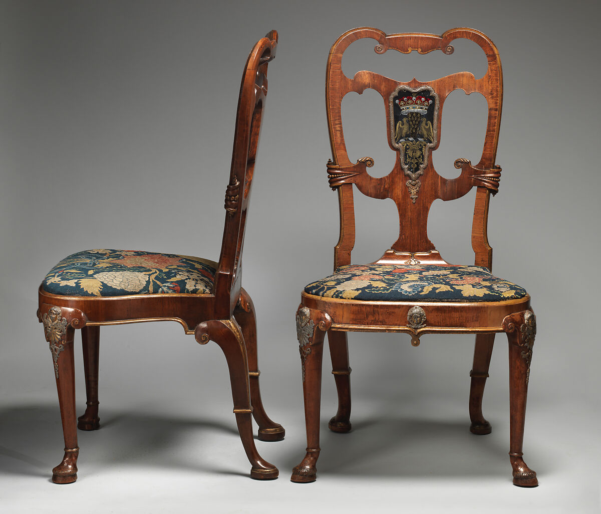 - Medium: Walnut and walnut veneer, parcel-gilt, the seat rails of beech; gilded lead mounts on the knees and front rail; verre églomisé panel mounted on the splat; covered in contemporary tent stitch embroidery on canvas needlework not original to the chair