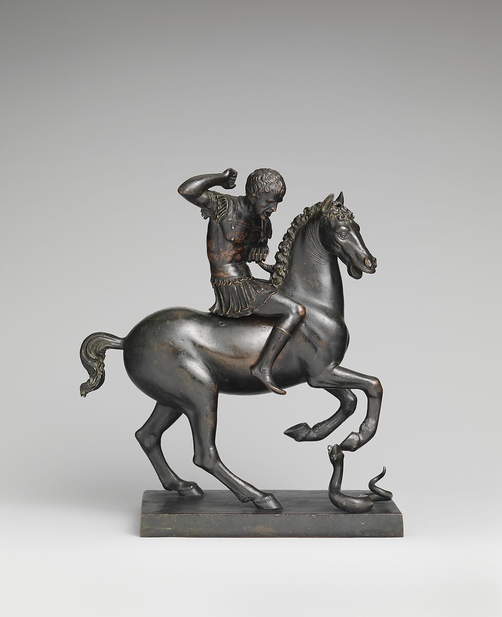 As his horse paws the air, a shouting rider raises his spear (now lost) to impale a snake. The statuette’s three figures were cast separately and later assembled to form the group. In a demonstration of virtuosic technique, the weight of the rider and horse balances effortlessly on the twin points of the horse’s rear hooves. The rare subject of this exquisite bronze derives from a precious classical cameo (a gem carved in relief).
