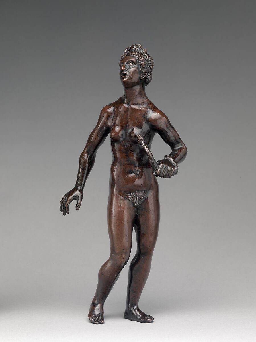 Patrick De Winter saw unfathomable resemblances to a Venus in the Walters Art Museum, Baltimore, sometimes ascribed to Antico.[2] He also sensed a strong relationship to Severo’s Queen Tomyris in the Frick, which indeed has similarly sloping shoulders and a knock-kneed stance but is far more vibrant and engagingly theatrical.[3] It is as yet unclear when Severo developed this un-anatomical female physiognomy, which sometimes works but more often fails.