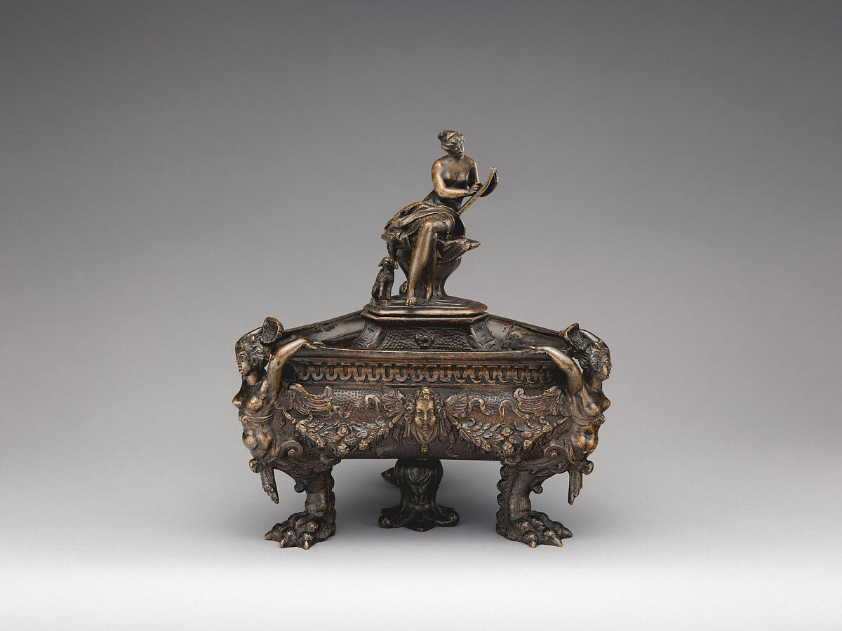 No satisfactory stylistic or technical background has been suggested for these over-the-top vessels. They should rest firmly enough on their three clawed feet; why then is there a rather massive middle floral foot under the middle of each as well? The finials rise from their triangular stands above triangular basins whose bottoms are surrounded by thin copper plates soldered into place but not tightly enough to prevent leakage. One has hardly seen Renaissance basins of inkwells needing such big areas, and the casts are extremely porous. Finials and bowls are treated much alike, with small dot marks on the draperies of the former, broader ones on the lionskin-like wrappings of the sphinxlike creatures at the basins’ corners. All the female personifications have similarly flowing locks and heavily lidded eyes. History is identifiable by her scroll, Vigilance by her rooster, its head since lost. History’s head, broken and loose, was recently restored. It is unclear why she should have a dog beside her, but nothing about these vessels makes perfect sense: perhaps least of all that the statuettes should float like small islands in their big containers. Hardly successful in any period, it is astonishing that either one should have inspired a mate. Cumbersome and in every way odd, they find no satisfactory equivalents in Venice or its outposts. Cautionary instincts and curiosity have prevented their being deaccessioned, as well as the thought that they might serve a purpose in an exhibition about fanciful nineteenth-century views of the Renaissance.