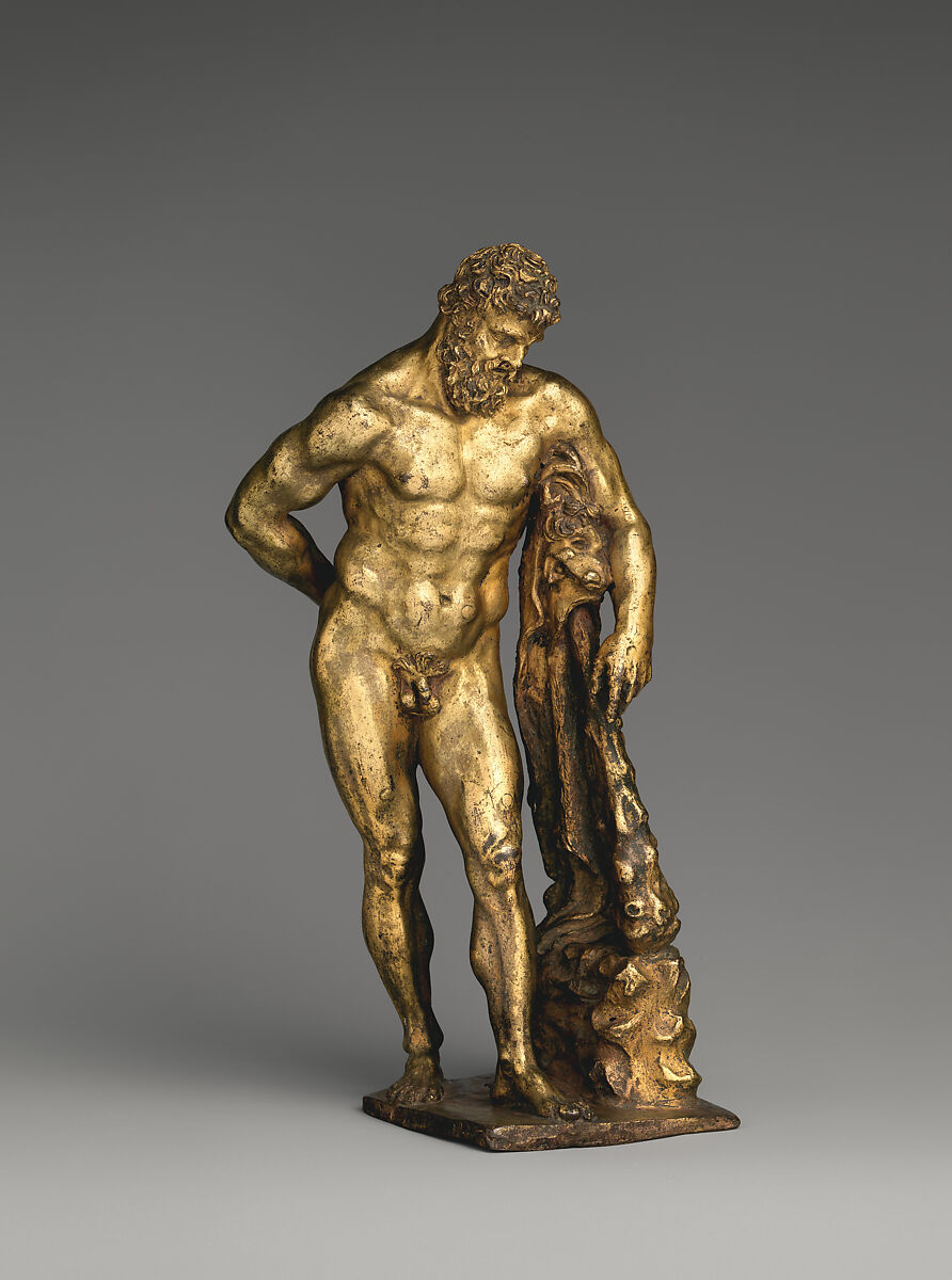 This is a reduction of the first-century B.C. marble signed by Glykon of Athens, which in turn is a Roman copy of the Greek original by Lysippos, sometimes called the “Weary Hercules.” It was discovered in 1540 in the Baths of Caracalla in Rome, entered the Farnese collections (hence is universally known as the Farnese Hercules), and is among the glories of the Museo Archeologico Nazionale, Naples.
