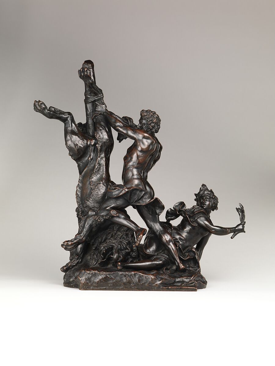 Hercules subdued the Nemean lion by order of his nemesis King Eurystheus, who ordered all twelve of his famous Labors. He is often shown wrestling with it but seldom if ever skinning it after slaying it. The figure reacting in fright at the side is a water nymph personifying a stream in the neighborhood of Mount Cithaeron, where Hercules performed this first of his Labors. As in all his groups, Lespingola cut the wax model into sections then reassembled them after casting. Here, there are three sections: lion with tree and ground, Hercules, and nymph. He availed himself of the lion’s tail, making it serve as a sprue for the casting.