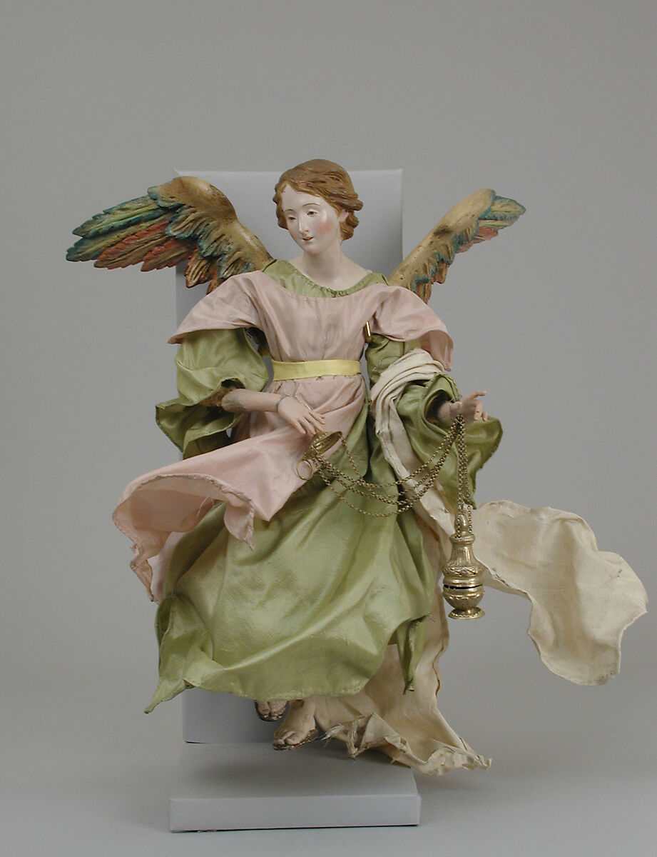 - Medium: Polychromed terracotta head; wooden limbs and wings; body of wire wrapped in tow; various fabrics