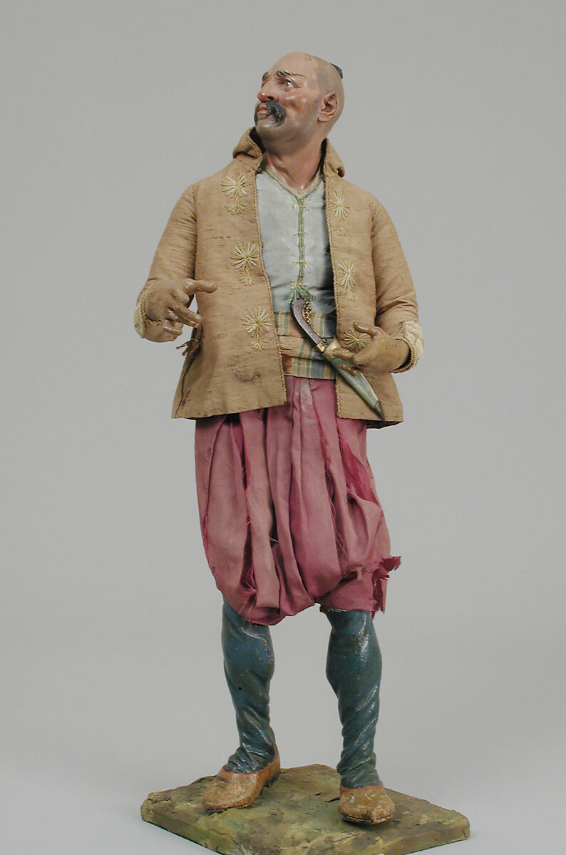 In 1964, Loretta Hines Howard generously presented to the Museum over 140 Neapolitan crèche figures, dating from the second half of the eighteenth century. The varied assortment includes figures from the three traditional scenes of a complete Neapolitan presepio: the Nativity, with angels, shepherds, and sheep; the procession of the three Magi, with their colorful retinue of attendants; and the varied and gay crowd of country and town people thronging the tavern, or inn, of Bethlehem — the diversorium mentioned by St. Luke, where on the Holy Night there was no place for Mary and Joseph. Averaging between twelve and fifteen inches in height, according to the position they were to take in perspective in the stage set, the figures are pliable and can be given poses at will, according to their facial expressions. Their bodies are made of tow and wire, their arms and legs are finely carved of wood, and their heads and shoulders are modeled of terracotta and accurately finished. Their attire, often enriched by accessories, jewels, and embroideries, is a sheer joy for the lover of folklore and eighteenth-century costumes.