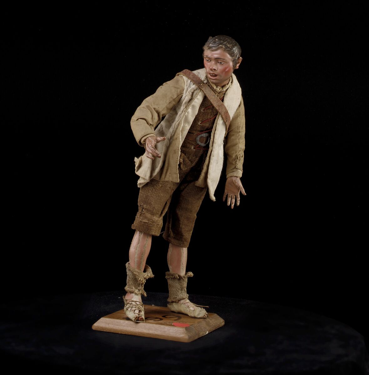 - Medium: Polychromed terracotta head and wooden limbs; body of wire wrapped in tow; cotton and burlap garments; leather belt, shoes and shoulder bag