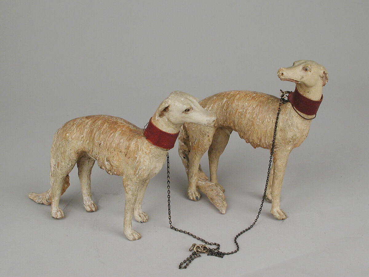 - Medium: Polychromed terracotta body; glass eyes; leather collar and metal chain