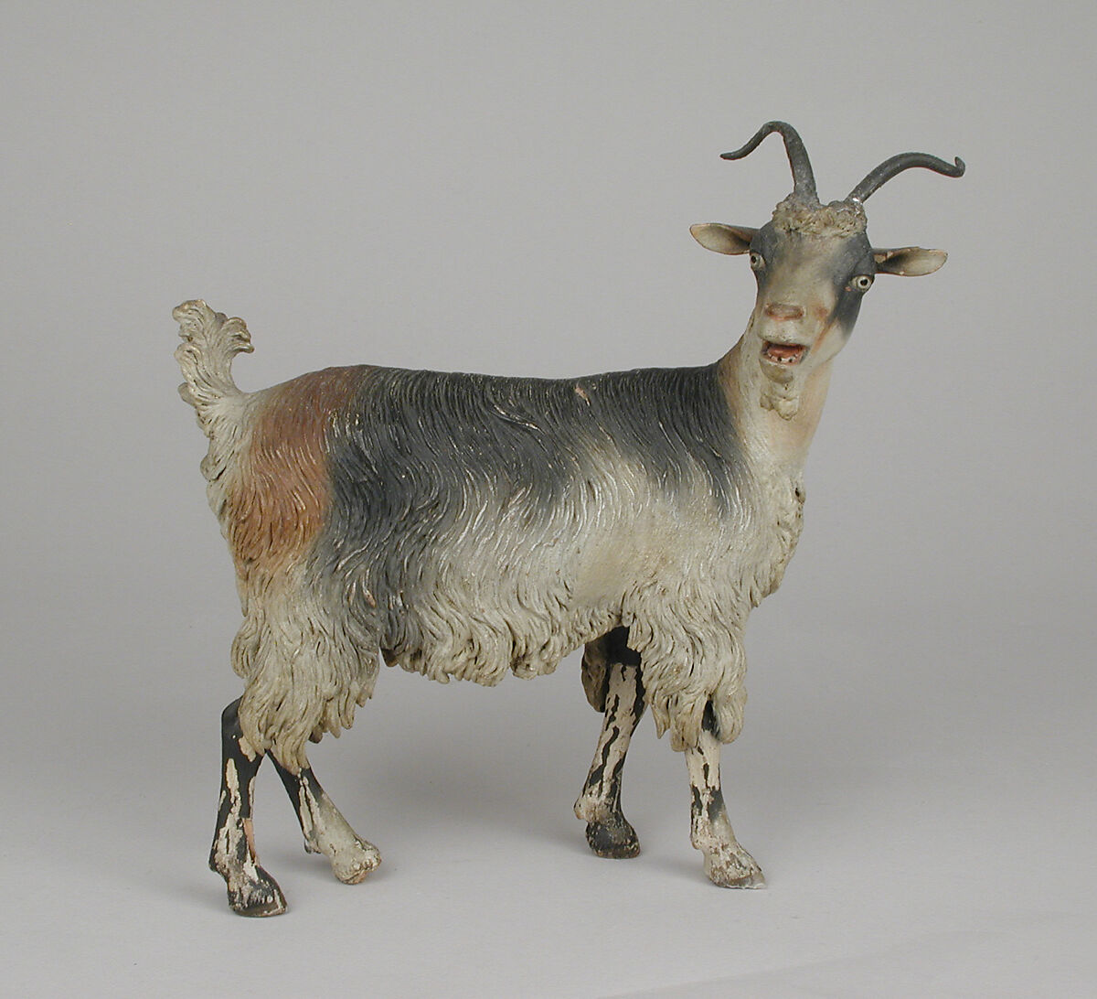 - Medium: Polychromed terracotta body, wooden legs, metal horns