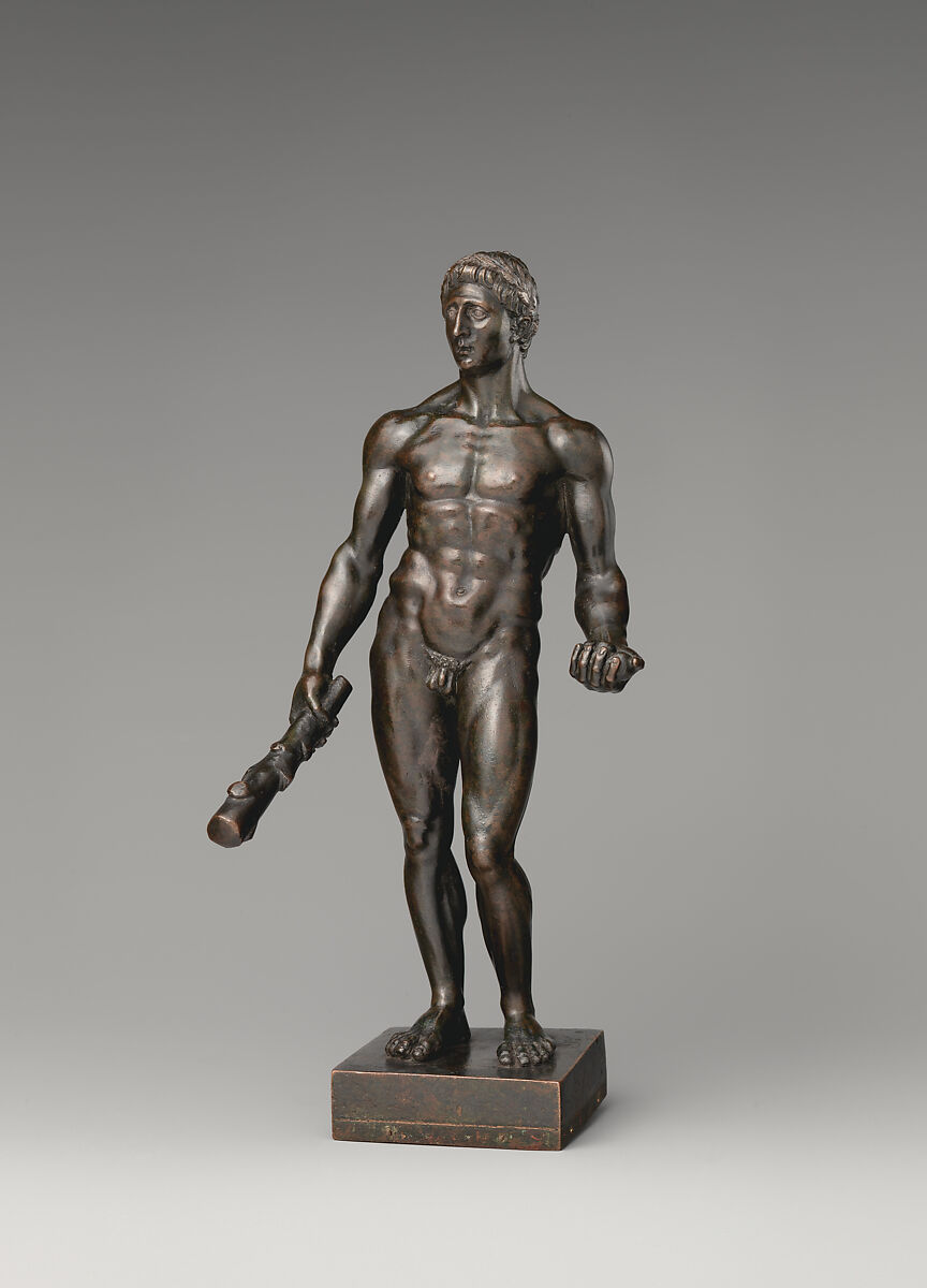 A reduction of the gilt-bronze colossus in the Palazzo dei Conservatori, Rome, famous in antiquity and ever since it was dug up in the fifteenth century, this bronze Hercules differs from the original in several respects.[1] The position of the legs is reversed, and the torso has lost torsion and authority, thereby compromising the contrapposto. The head is larger in relation to the whole, the hair artfully feathered, and the gnarly club shorter. In cataloguing the statuette for The Met, Johanna Hecht noted similarities in the stances of two ancient ones in the Bibliothèque Nationale, Paris,[2] but their poses are more coherent, and our imitator’s conception probably derived, ultimately, from the large work in Rome.