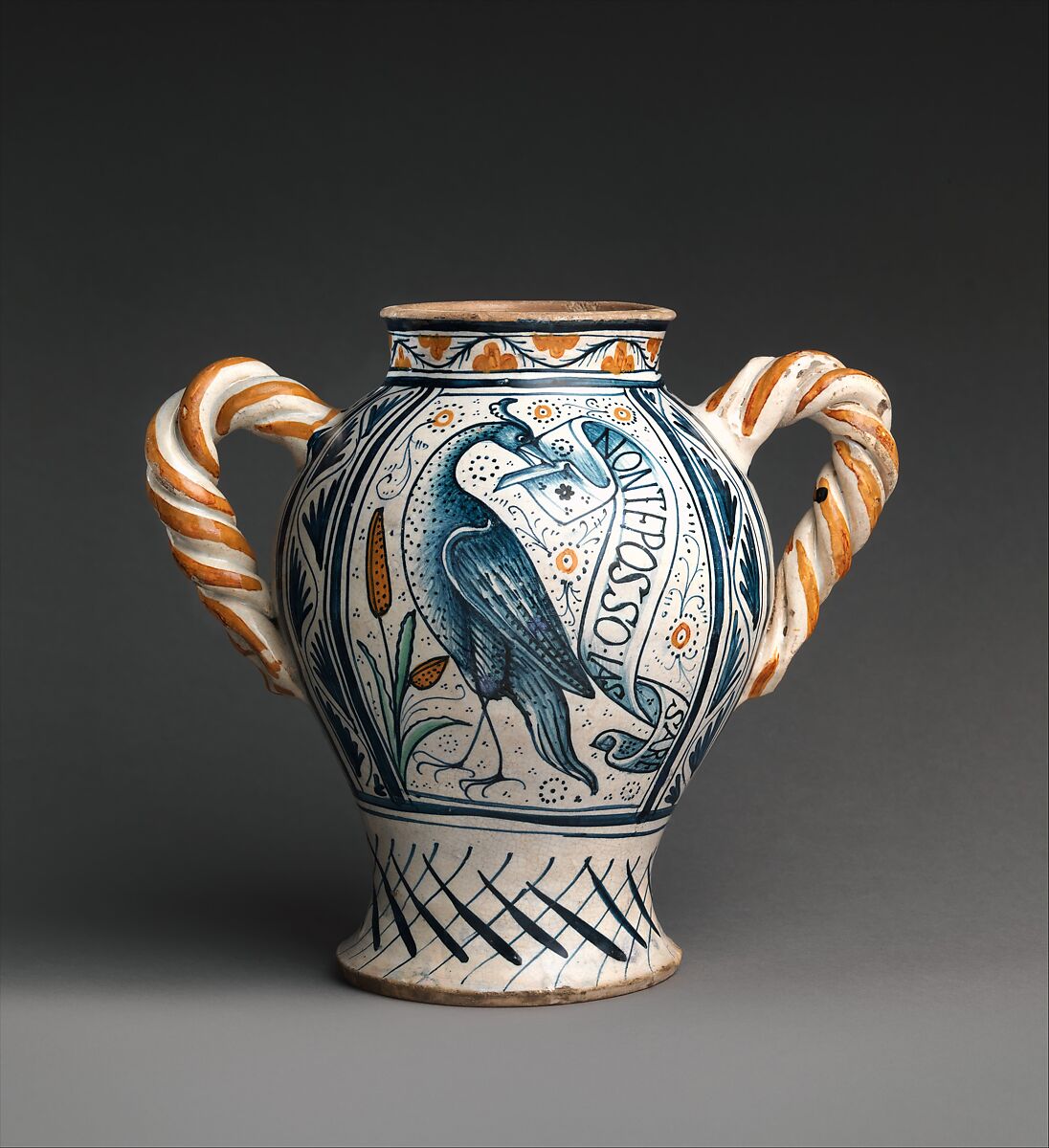 Amorous symbols decorate this vessel. On one side, a graceful bird clutches a scroll inscribed with a romantic dedication: Non te posso lassar (I cannot leave you). This declaration of fidelity is paired, on the opposite side, with the image of an arrow piercing a heart from which flowers and acorns bloom. The broad span of the handles and the two-sided design suggest that it was intended more for display than for storage—possibly as a gift between lovers.