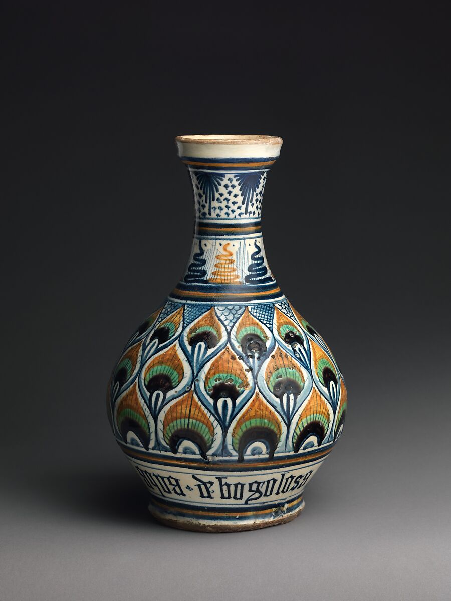 Vessels of this shape, with long, narrow necks, were designed to hold liquid preparations. In this example, the inscription shows that it was meant to contain water of the bugloss plant, once valued as an antivenom. Such labels first appeared on Italian pharmacy jars in the mid-1400s and became commonplace by the end of the century. The striking peacock-feather ornament helps trace the bottle’s manufacture to the town of Pesaro, where it was a favorite design.