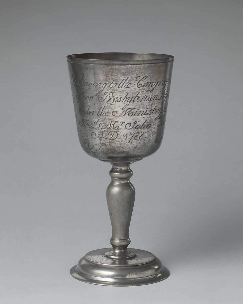 The inscription on this chalice indicates that it and a pewter flagon (65.199.4) belonged to the same congregation under the ministry of John Fairly.